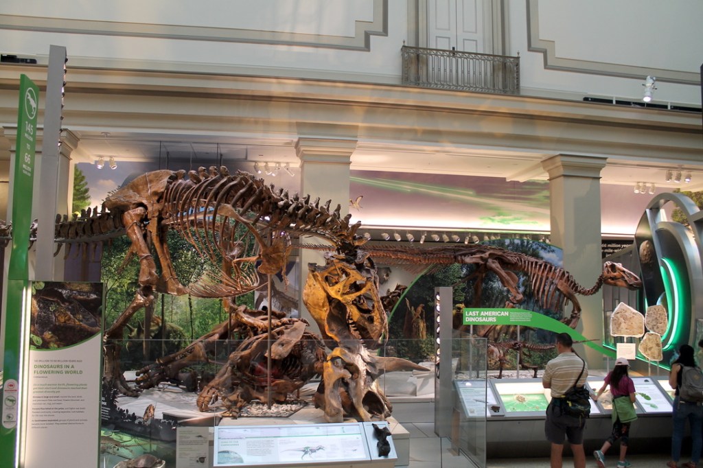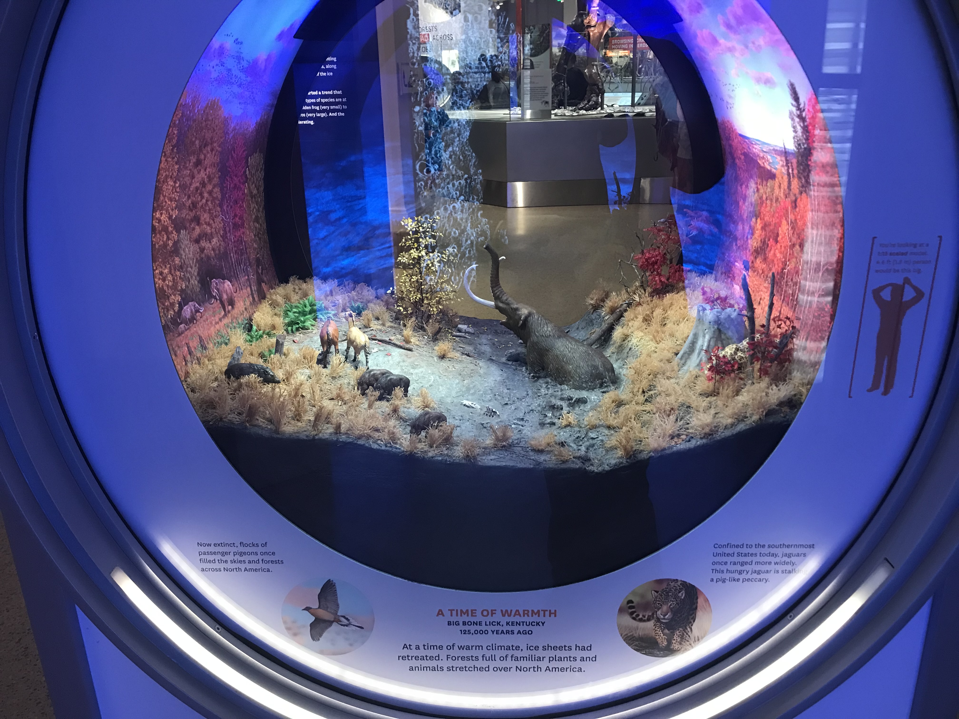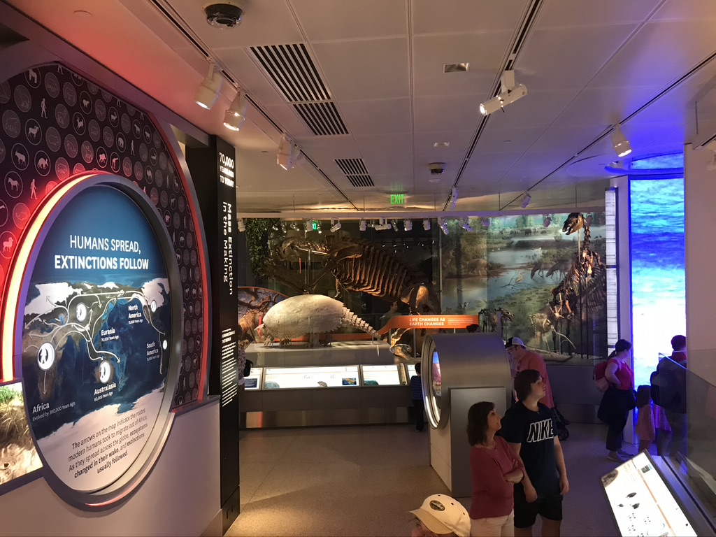 The hardest-hitting message [in Deep Time] is about the modern climate crisis. The fact that industrial activity is profoundly warming the climate—a change that comes with dire consequences—is presented in clear, matter-of-fact language. It’s not preachy, it’s not political, it’s just the truth. The exhibition does not explicitly say we should stop harming the planet (although we should), but it clearly presents the evidence that we are, and that we have the ability to stop. This information is centered on an overlook called “the bridge.” The centrality of this location and its proximity to the dinosaurs makes the climate narrative unmissable. The nature of the modern media landscape is such that many NMNH visitors may well have never seen this message presented in non-political terms. I’m eager to see the results.