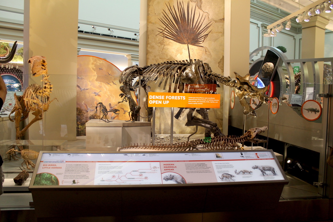 One of the stated goals of Deep Time’s creators was to help visitors understand that the history of life on Earth wasn’t just about dinosaurs. “Are we doing a disservice by overdoing dinosaurs?” is a common refrain among folks who worry about how we relate paleontological science to the public. Whether or not this is a real problem, Deep Time seems comparatively constrained when it comes to dinosaur content. According to my Big Spreadsheet, NMNH has fewer dinosaur fossils on display than is typical among its peer institutions. Just 18% of the included vertebrate specimens are dinosaurs, and these are almost always intermingled with the other animals and plants that made up their ecosystems.