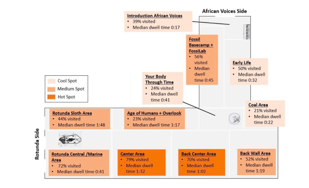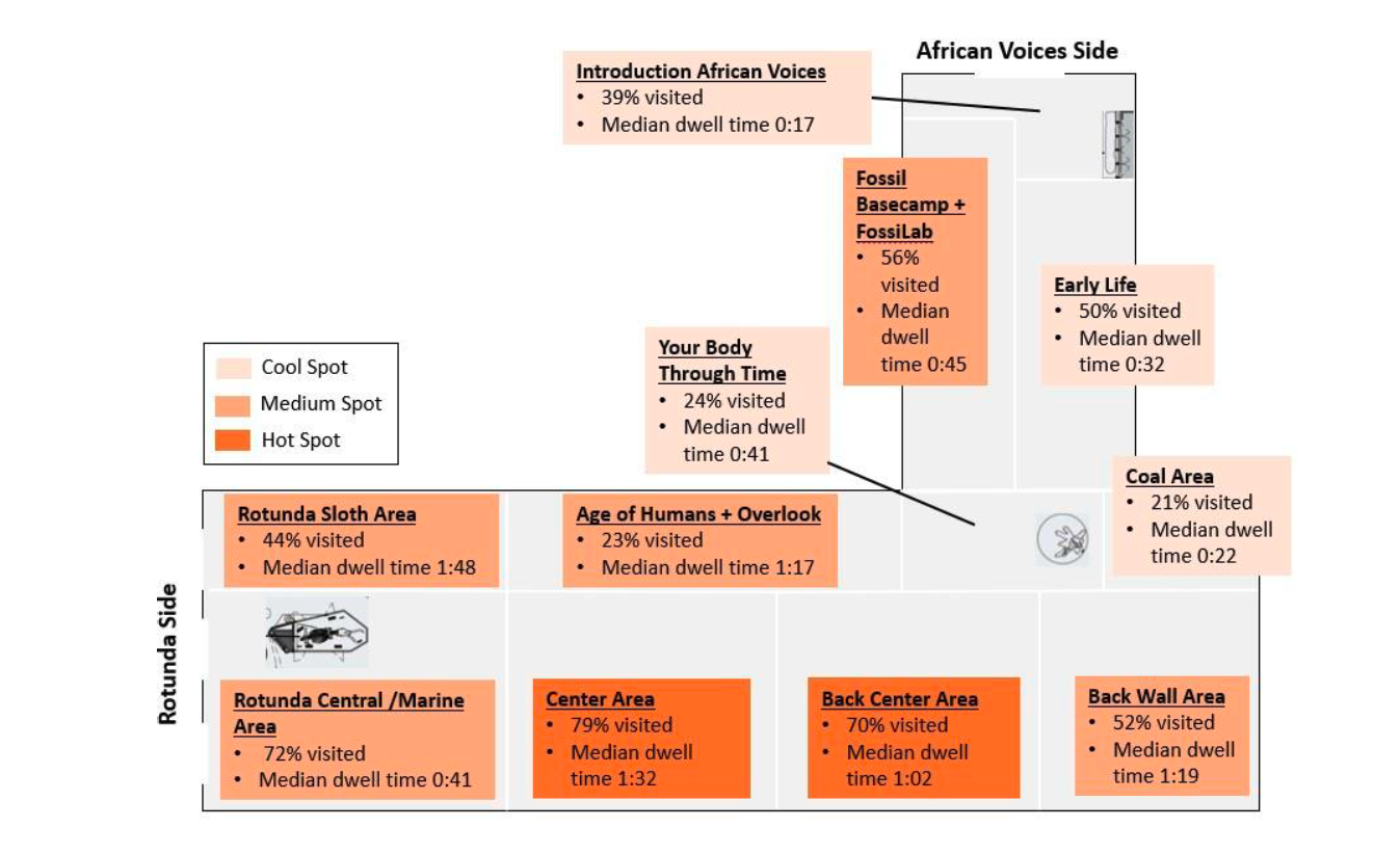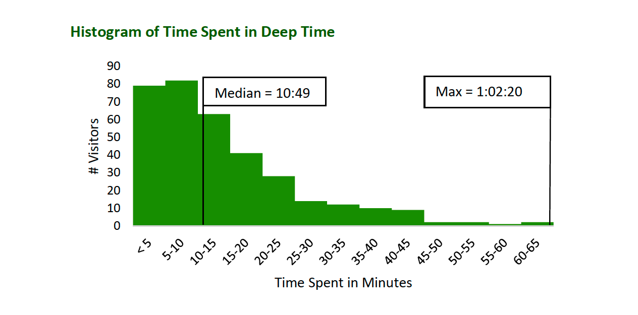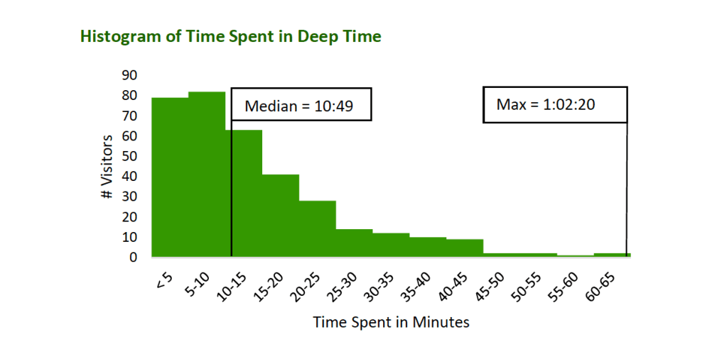 Given how long it takes to conceptualize an exhibit and design it down to the inch (a year per 3,000 square feet is a decent rule of thumb), it can be demoralizing to see how little time audiences actually spend there. Deep Time occupies 31,000 square feet and contains 83 individual displays. RK&A evaluators found that the median dwell time was 10 minutes and 49 seconds, with a median of 11 displays visited. Notably, longer dwell times did not correlate with a higher number of stops. Dwell time was higher for visitors that entered from the main rotunda than from African Voices, suggesting that sight lines might play a significant role in what visitors choose to look at.