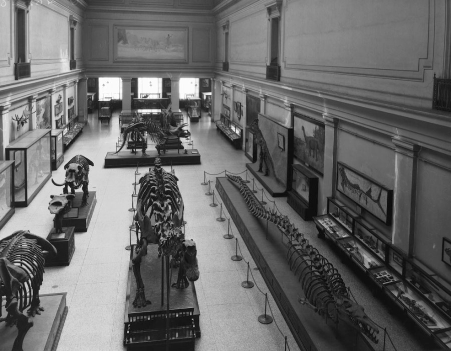 For a time, the Hall of Extinct Monsters had two Mastodon skeletons on display, visible on the far left. Photo courtesy of the Smithsonian Institution Archives.