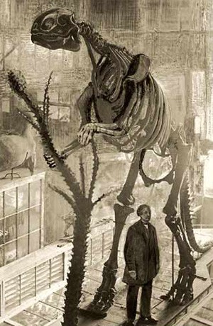 In 1868, the Academy museum made a landmark contribution to paleontology by hosting the first mounted dinosaur skeleton ever constructed. The mount, the work of paleontologist Joseph Leidy and sculptor Benjamin Waterhouse Hawkins, depicted Hadrosaurus foulki, the first dinosaur discovered in North America and at the time the most complete dinosaur ever found. With only two limbs, a section of the spinal column and some other odds and ends to work with, Hawkins invented many of the mounting techniques that are still in use today. For instance, Hawkins created mirrored duplicates of the left limb bones for use on the animal’s right side, and reconstructed best-guess stand-ins for the skull, scapulae and most of the vertebrae using extant animals as reference. By modern standards, the Leidy-Hawkins Hadrosaurus mount wasn’t especially accurate (the sculpted scapulae and vertebrae resemble those of a mammal, not a reptile; the skull, based on that of an iguana, turned out to be completely off the mark; the fully upright, kangaroo-like posture is now known to be anatomically implausible), but it nevertheless presented the first-ever opportunity to stand in the presence of a dinosaur. Extinct animals were already known to the public, and some had even been mounted, but the Hadrosaurus was so bizarre, so utterly unlike anything alive today, that it really opened people’s eyes to the unexplored depths of the Earth’s primordial history.