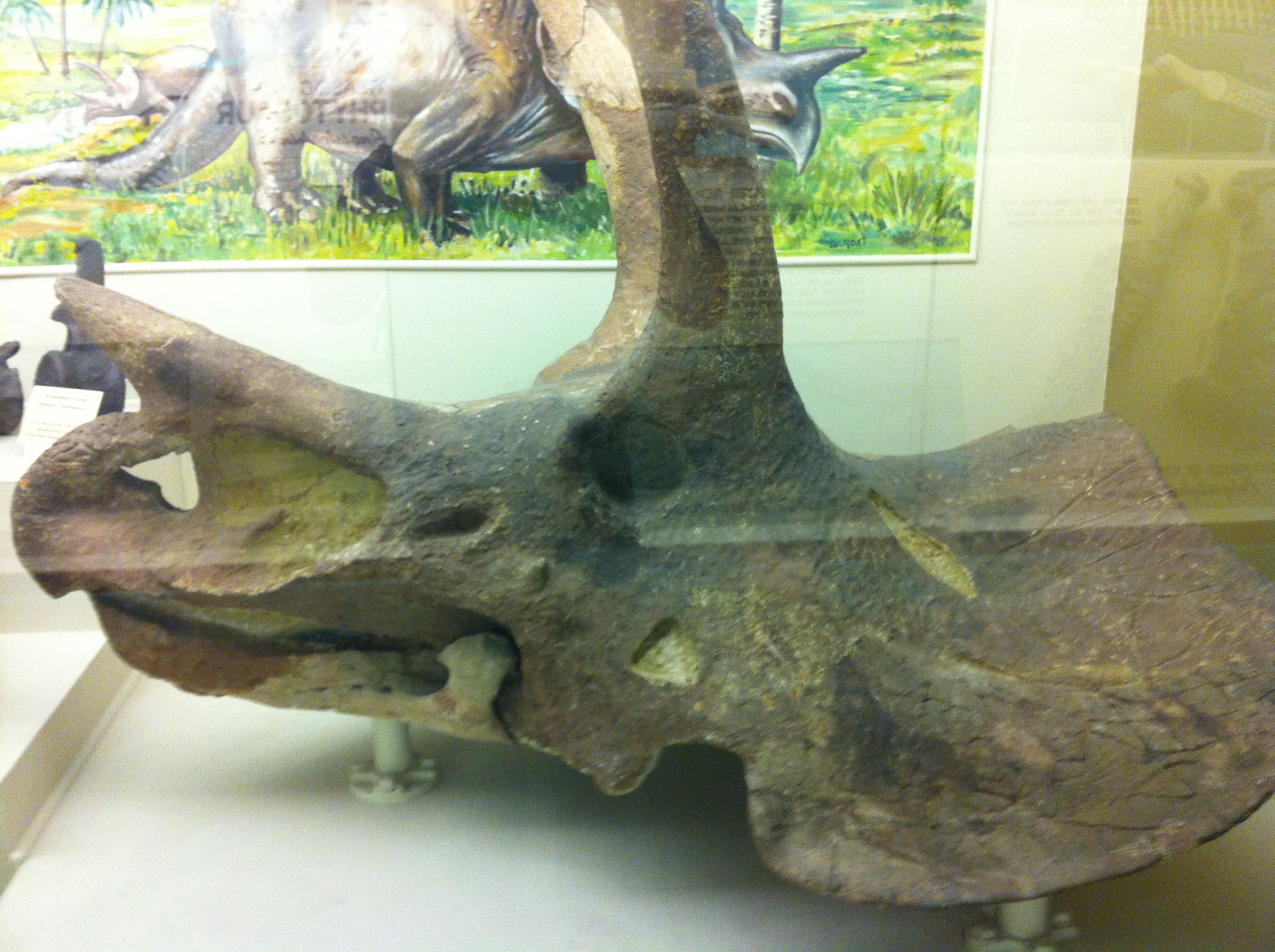 Among the Museum’s basement paleontology exhibits is a case of dinosaur fossils that has literally gone unchanged since the 1950s. Although this time capsule of mid-century museum design is of some historical interest, it would be nice if those sauropod limb bones weren’t labeled “Brontosaurus” (to be clear, the whole museum doesn’t look like this, the staff has been slowly but surely modernizing the exhibits). Of particular importance is the Triceratops skull (specimen 422) on the left side of the case. While there is no historical information on its label, this specimen has been with the museum for over 115 years, having been unearthed and put on display only six years after O.C. Marsh first named and described Triceratops.