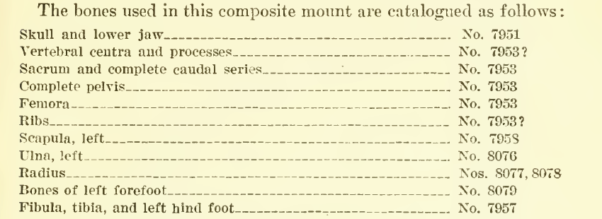 In 1917, most of the dinosaur mounts on display at NMNH came from fossils collected by Marsh for the US Geological Survey, and many represented species also on display in New York, Pittsburgh and New Haven. Accordingly, Gilmore was doubtlessly enthused by the prospect of displaying a dinosaur exclusive to Smithsonian. He awarded the task of creating a Brachyceratops mount to preparator Norman Boss, who would spend 345 working days on the project. Of the five individuals found in Montana, USNM 7953 was selected as the basis for the mount because it was the most complete, with the sacrum, pelvis, femora and complete set of caudal vertebrae found articulated in situ. Helpfully, Gilmore published a list of precisely which parts of the mount came from which individual specimen (see below). This was a marked contrast from some of his contemporaries at other museums, who would not bother to record such information, or even actively obscure how many disparate specimens they were using to build their mounts.