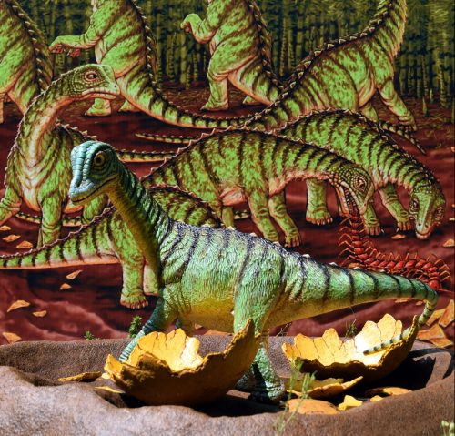 The finished mural was so cool that I couldn’t help but ask for more. One under-reported virtue of the Dinosaur Park collection is that we have sauropod remains from a variety of ages and sizes – from 70-foot adults to tiny hatchlings. I suggested a single image of a baby sauropod to help illustrate these animals’ remarkable growth potential. Shoe turned around and produced two full paintings and a life-sized model. The man is seriously unstoppable.