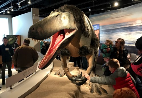 During the very well-attended opening event, Keillor gave a standing-room-only talk about creating the model. Dryptosaurus is only known from a handful of fossils, the most complete parts being the arm and leg. Working with Richard Kissel, who served as the project’s scientific advisor, Keillor had to make a number of educated choices to turn the available fossil material into a 20-foot fleshed model. The shape of the head, for example, is based on that of Jane, while the tiny, millimeter-sized scales are informed by recently published skin impressions of various tyrannosaurs. Less certain is the choice to give Dryptosaurus a two-fingered hand. For the time being, the three-fingered skeletons Research Casting International built for the New Jersey State Museum are no less reasonable.