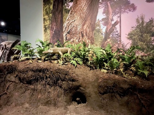 Unfortunately, the 2006 version of the Triassic gallery never had much drawing power—the lure of the larger dinosaurs around the corner was too great. This was a shame, because the Triassic is a really important chapter in the story of life on Earth. Life bounced back after the biggest mass extinction ever, and the new groups that evolved on land would be major players up to the present day. The ancestors of everything from crocodiles and turtles to mammals and dinosaurs can be traced to this time. We thought the origin of mammals was particularly important to emphasize, both because these were our distant ancestors and because the fact that mammals have been around about as long as dinosaurs have isn’t widely known. The gallery already had a small case of Mesozoic mammal teeth, but it was almost completely ignored by visitors. The revamped display needed to put the mammal story front and center.