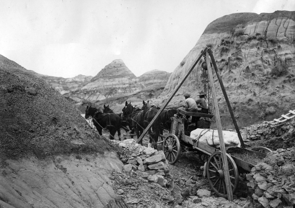With Charles M. and Levi in row, Charles H. got to work hunting for dinosaurs not far from where Brown was working. The two teams were generally friendly with one another, spending their leisure time together and even sharing Sunday picnics. Charles H. was also able to learn the basics of operating along the Red Deer River from the AMNH crew. A floating barge made for a convenient mobile base camp, but face nets were mandatory to protect from the incessant biting insects. The biggest inconvenience was the need to move water and supplies from the river to the fossil quarries (and fossils back to the river)—often a multi-mile trek over uneven terrain.