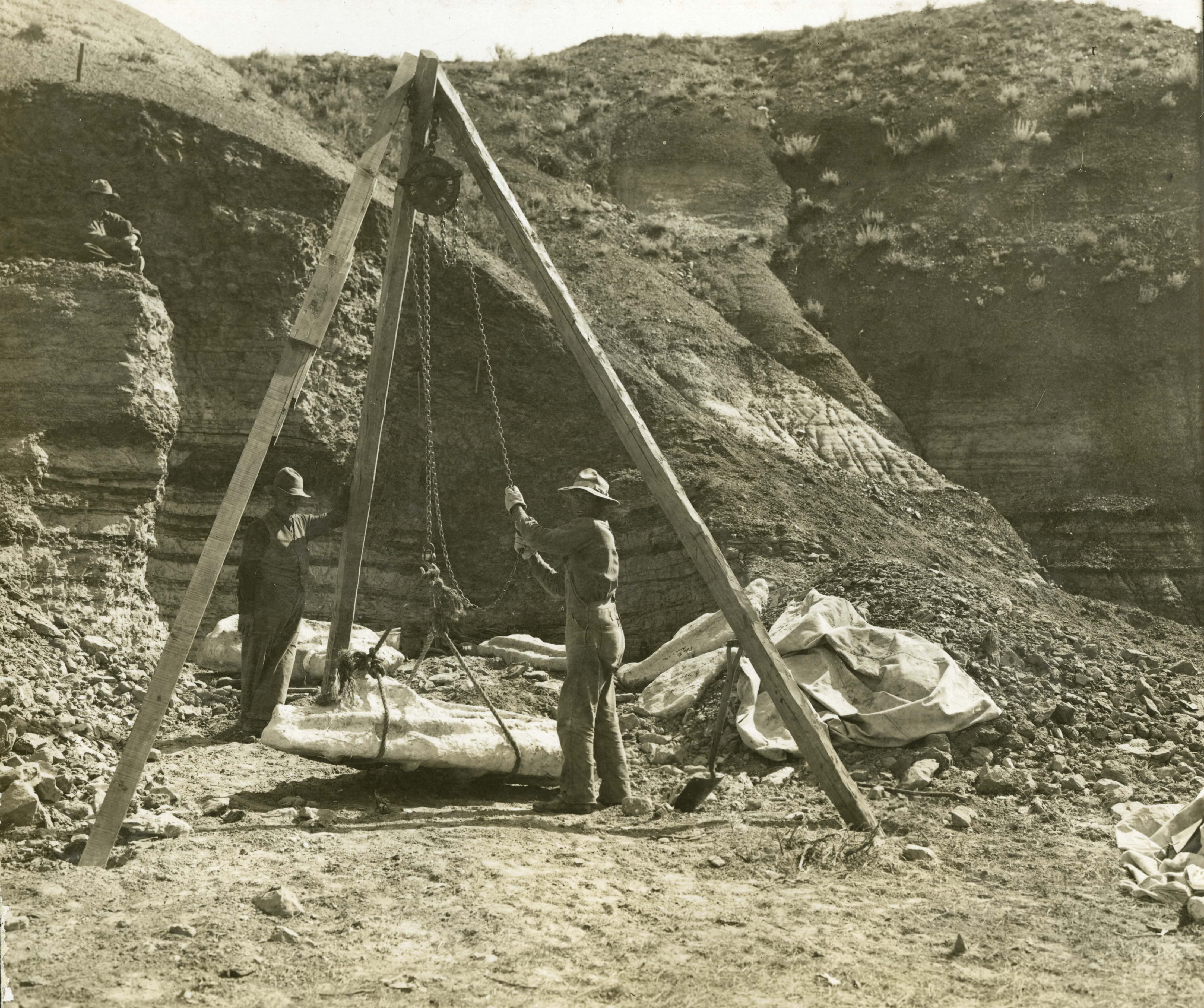 By 1897, George and Charles M. (then aged 14 and 12) were regular hands on their father’s expeditions. And just like their father, they could apparently smell fossilized bone. Among other innovations, the Sternbergs built a tripodal pulley rig for hoisting plaster jackets out of the ground—a far cry from Charles H.’s early years, when he was prying out individual bones with a butcher knife. In addition to finding fossils on demand, the Sternbergs also accumulated a growing backlog of fossils for sale. Since the family business was never incorporated, records of what they had in inventory at any given time are sparse.