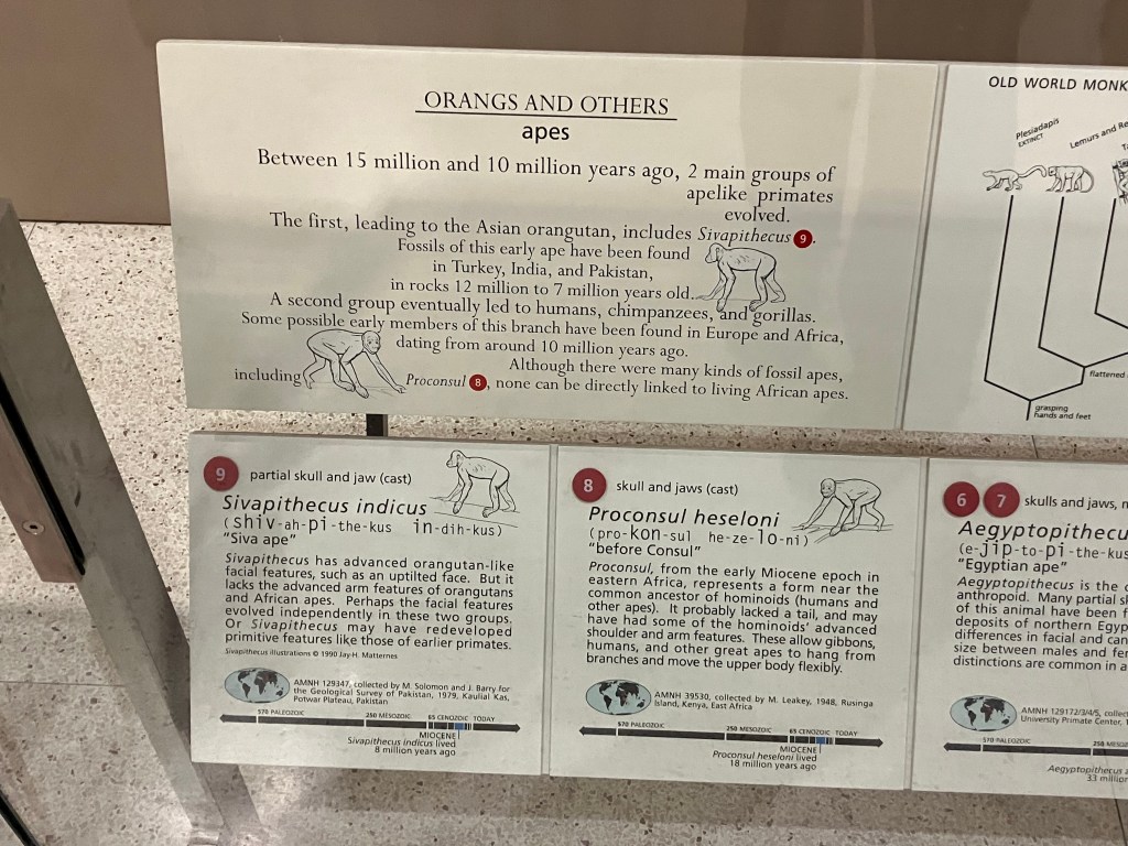 Within the galleries, the central pillars that update visitors on where they are in the tree are generally ignored. Part of the problem is that displays which highlight the three-fingered hand, the stirrup-shaped stapes, and other seemingly minor features that unify evolutionary groups are not especially compelling. And although I appreciate the wide open and well-lit spaces, I think the design of the halls might be working against the interpretation. It’s hard to tell where one grouping ends and another begins when every surface is either white or made of glass.