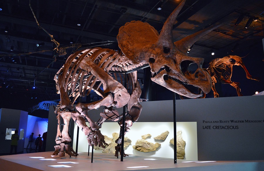 Meanwhile, the Houston Museum of Nature and Science opened its colossal, 30,000 square foot Hall of Paleontology in 2012. Among the dozens of mounted skeletons on display is Lane, reportedly the most complete Triceratops ever found. The museum purchased the skeleton from the Black Hills Institute, and the company also constructed the display mount. Robert Bakker, who curates the Hall of Paleontology, specifically requested that Lane be given a straight-legged, trotting pose. With two legs off the ground, this display emanates strength and speed.