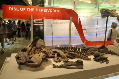One of the stated goals of Deep Time’s creators was to help visitors understand that the history of life on Earth wasn’t just about dinosaurs. “Are we doing a disservice by overdoing dinosaurs?” is a common refrain among folks who worry about how we relate paleontological science to the public. Whether or not this is a real problem, Deep Time seems comparatively constrained when it comes to dinosaur content. According to my Big Spreadsheet, NMNH has fewer dinosaur fossils on display than is typical among its peer institutions. Just 18% of the included vertebrate specimens are dinosaurs, and these are almost always intermingled with the other animals and plants that made up their ecosystems.