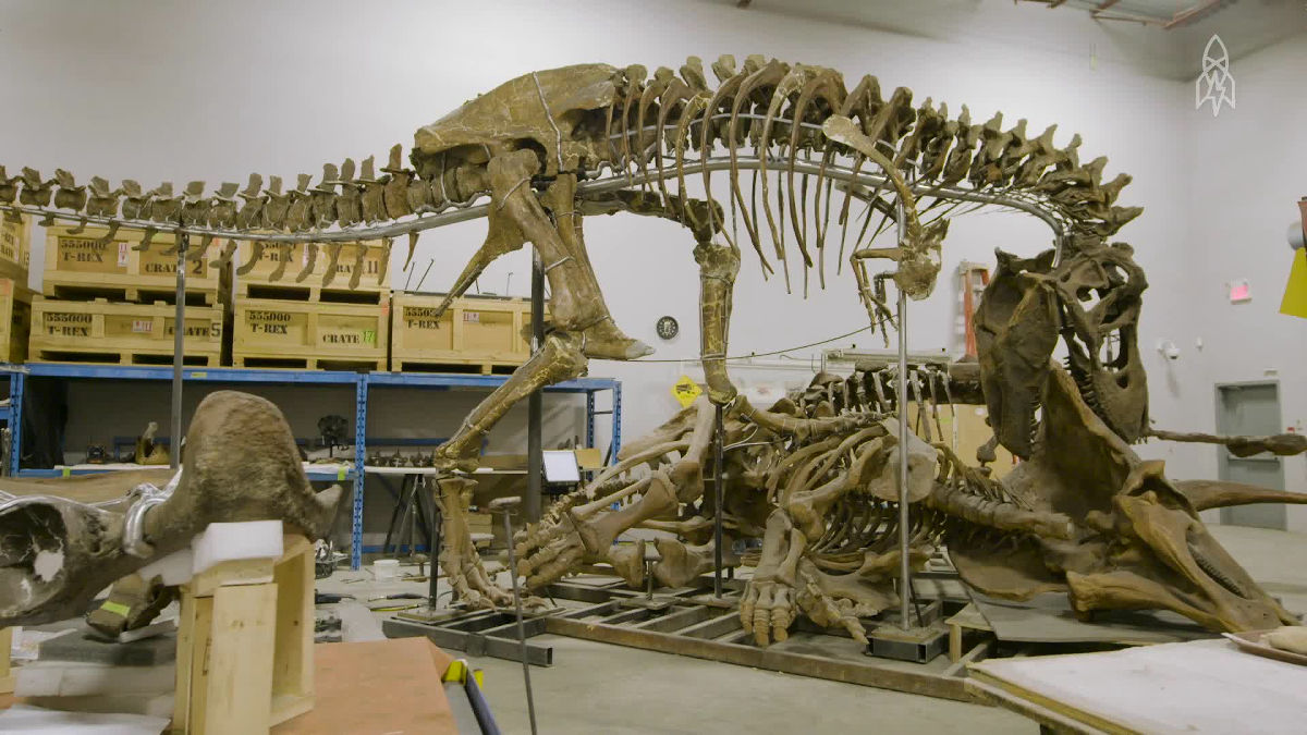 The Nation’s T. rex, temporarily assembled in the Research Casting International workshop. Image by Great Big Story.
