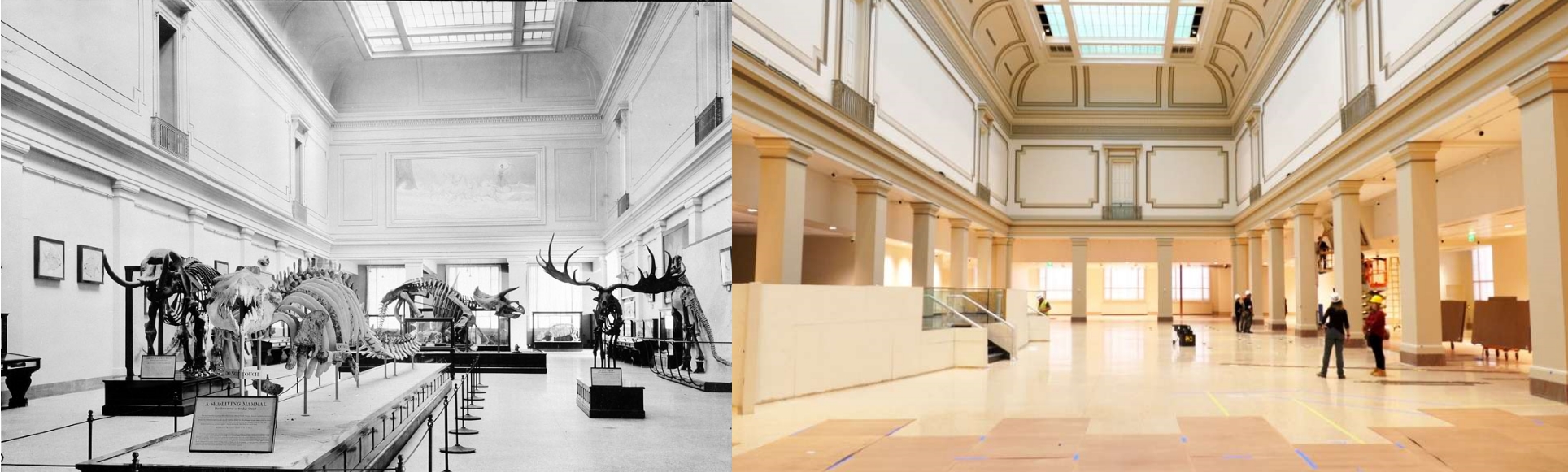 The building that is now NMNH opened in 1910. Its granite-heavy, Beaux Arts construction was a departure from the Victorian style of the first United States National Museum, but it looked right at home with the other federal buildings around the National Mall. As originally designed, the building resembled a squat “T” from above, with three large wings (facing east, north, and west) extending from a central rotunda. The east wing — a vast space with bay windows, intricate plaster detailing, and a skylight three stories up — has always housed fossil displays. Over the course of the 20th century, however, the once spacious hall was repeatedly carved into smaller sections. Windows and architectural flourishes were covered up, and by the time the last round of renovations was completed in 1985 the east wing had become cramped and gloomy.