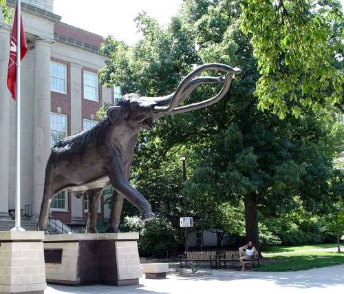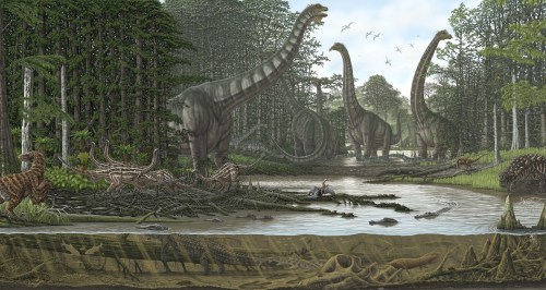 Located in northwest Nebraska and dating to about 22 million years ago, the Agate Springs bone bed is an aggregation of fossilized animals on an astonishing scale. Like the Carnegie quarry at Dinosaur National Monument, it provides a snapshot of an ecosystem at a moment in geologic time. But while a high estimate of the individual dinosaurs represented at Carnegie Quarry is in the hundreds, the main bone bed at Agate Springs may well contain tens of thousands of animals. The vast majority of fossils come from the tapir-sized rhino Menoceras, scrambled and packed together in a layer up to two feet thick. Moropus, Daeodon, and an assortment of other hoofed animals and small carnivores have also been found. These animals may have gathered during a drought and succumbed to thirst or disease, before the returning rains rapidly buried their remains. It’s also possible that the bone bed represents a mass drowning during a flash food. Since different parts of the site vary in density, Agate Springs likely represents multiple mortality events over a number of years.