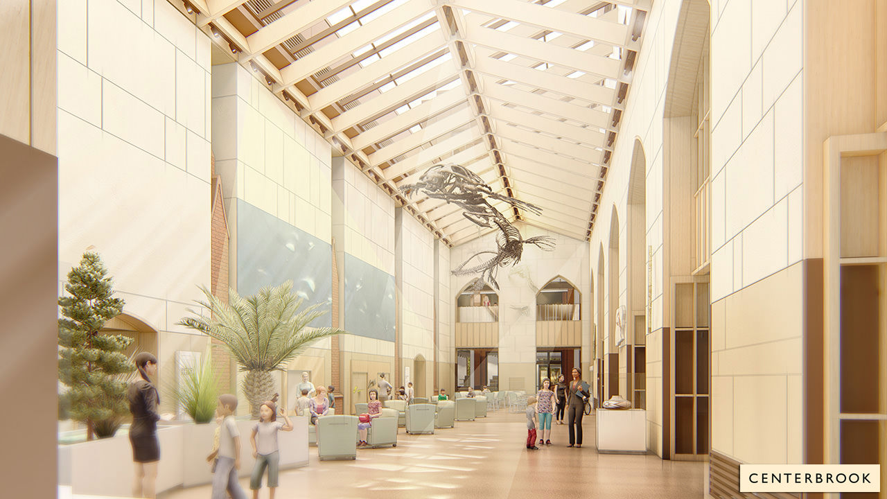 At the heart of the renovated museum will be the central gallery, a brand-new structure filling in an empty space between the YPM and the Environmental Science Center to the east. It will run parallel to the dinosaur hall, sharing a wall on the existing gallery’s west side. Although the overall design is quite modern, the scale and color palette of this new 4-story space is meant to complement the French Gothic revival architecture of the original museum building. Lit by a skylight and filled with comfortable seating, the designers hope that the central gallery will be a space for students and museum visitors to relax and co-mingle, better integrating the museum into the campus community.