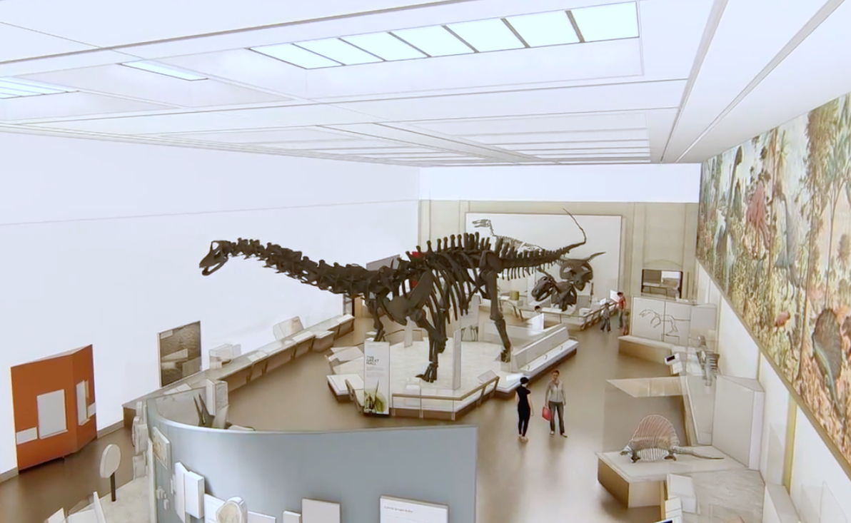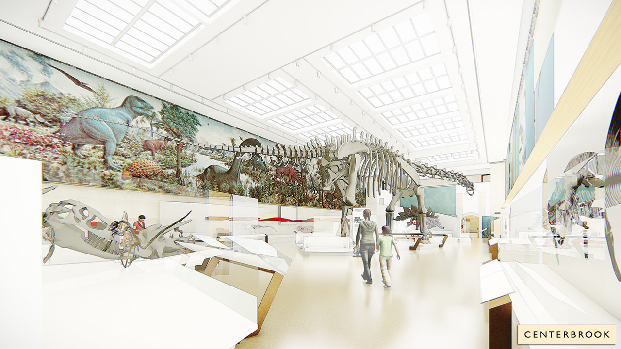 These discussions must have been the basis for the set of concept images released alongside the launch of a new fundraising effort in 2013 (why they needed to fundraise when Yale has a $30 billion endowment is beyond me—I promise this will be my only snarky aside about that). Architectural firm Studio Joseph envisioned wide-open and well-lit spaces, in which the grey carpet and grid-patterned walls were replaced by bright earth tones accentuated by ash wood panels. A mezzanine on the west side of the dinosaur hall would have allowed visitors to view The Age of Reptiles directly, rather than from the floor. A long, continuous case directly beneath the mural would contain fossil specimens that corresponded with the scene above.