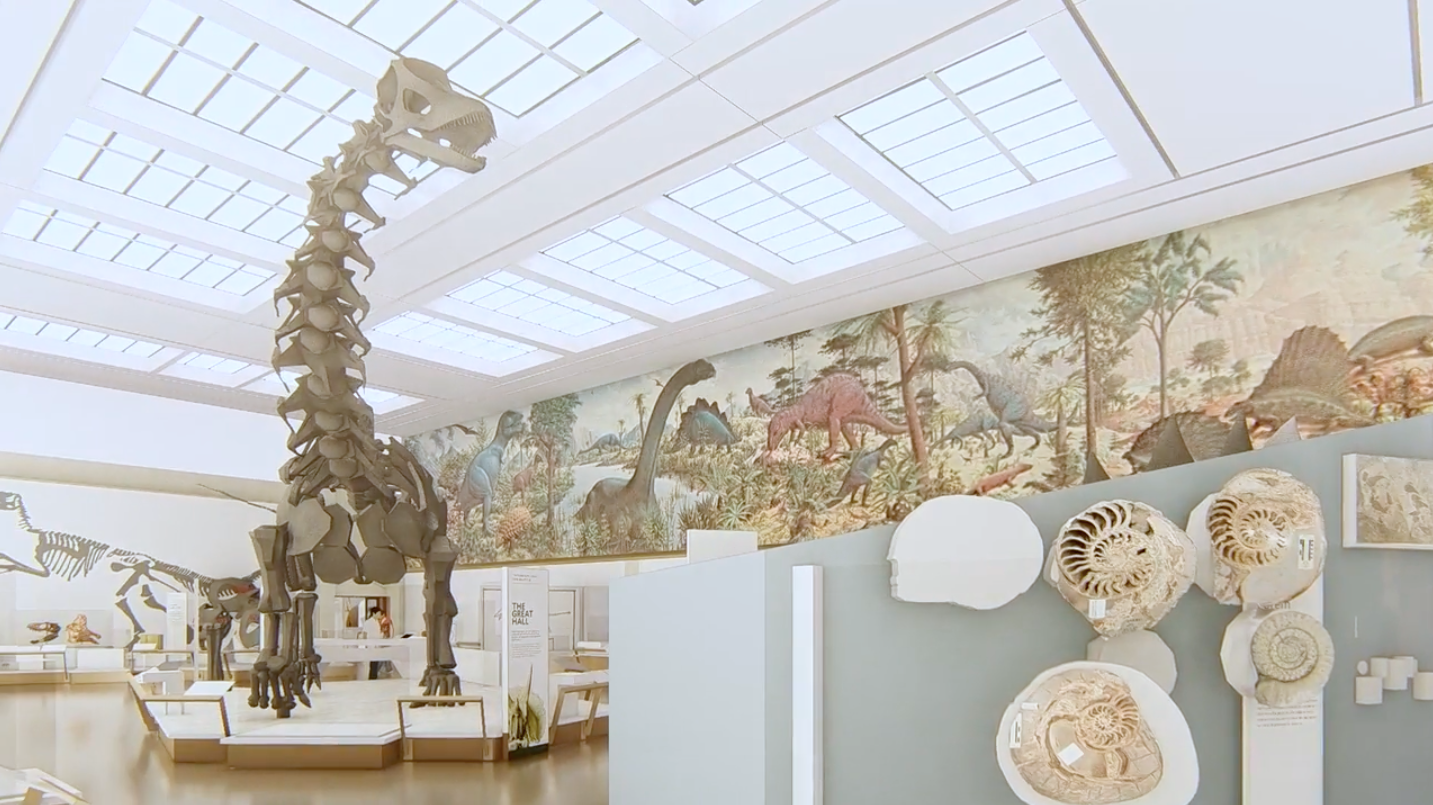 The view upon entering the dinosaur hall from the central gallery. Source