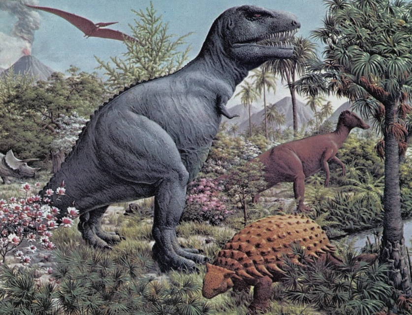 Kish’s art is instantly recognizable for its portrayal of active, highly expressive dinosaurs in breathtakingly realized landscapes. The worlds she created – particularly the skies – have an almost poetic beauty, while the plants and animals that inhabit them drip with dew and pulsate with life. Kish’s work is often overlooked today because her dinosaurs are shrink-wrapped in the extreme, sometimes appearing emaciated or even ghoulish. The skeletal look is very much out of vogue (modern paleontologists prefer their dinosaurs appropriately bulked out with muscle, fat, and feathers), but as Christian Kammerer pointed out on twitter, it’s important to consider Kish’s art in context. Her carefully-researched work was a powerful counterpoint to the rotund, shapeless dinosaurs that had dominated paleoart in preceding decades, and a critical step on the road to the reconstructions we know today.