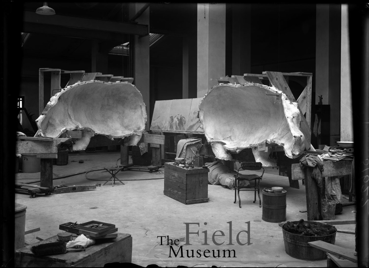 Instead, Hermann prepared a single Tyrannosaurus mount, combining the 1908 specimen with plaster casts of the hips and femur from the 1905 holotype. The original skull was impractically heavy, so a cast was used in its place. Missing portions of the skeleton, including the arms, feet, and most of the tail, were sculpted by hand using bones from Allosaurus as reference. During the early 20th century, constructing fossil mounts was a relatively new art form, and while Hermann was one of the most talented and prolific mount-makers around, his techniques were somewhat unkind to the fossil material. Bolts were drilled directly into the fragile bones to secure them to the armature, and in some cases steel rods were tunneled right through them. Any fractures were sealed with plaster, and reconstructed portions were painted to be nearly indistinguishable from the original fossils. Like most of the early AMNH fossil mounts, preserving the integrity of the Tyrannosaurus bones was secondary to aesthetic concerns like concealing the unsightly armature.