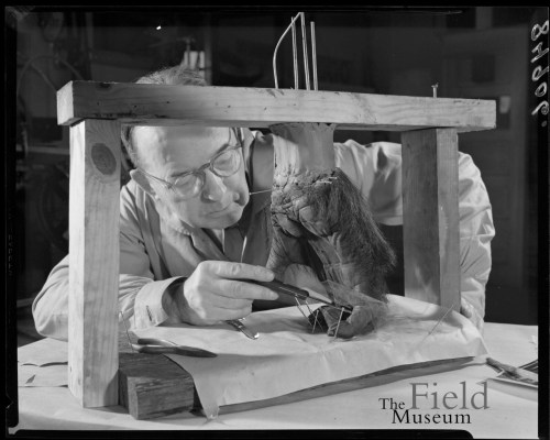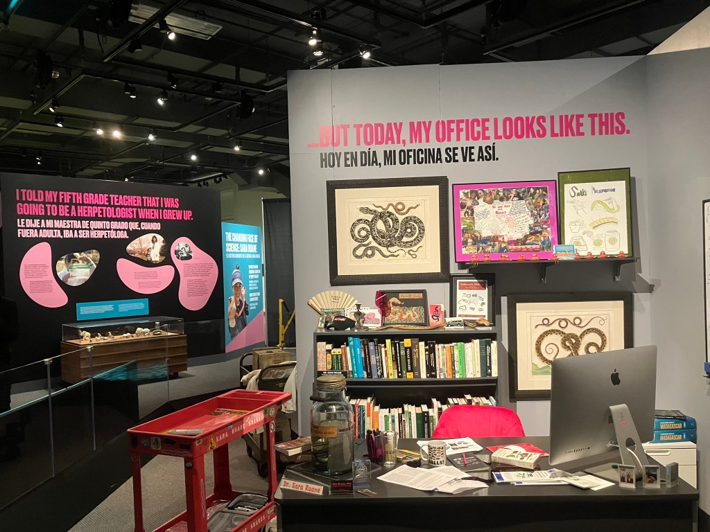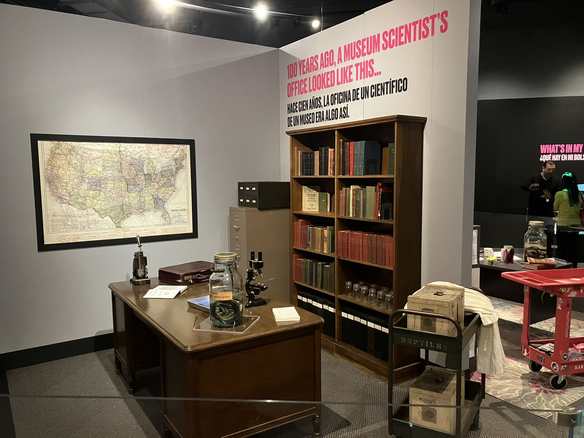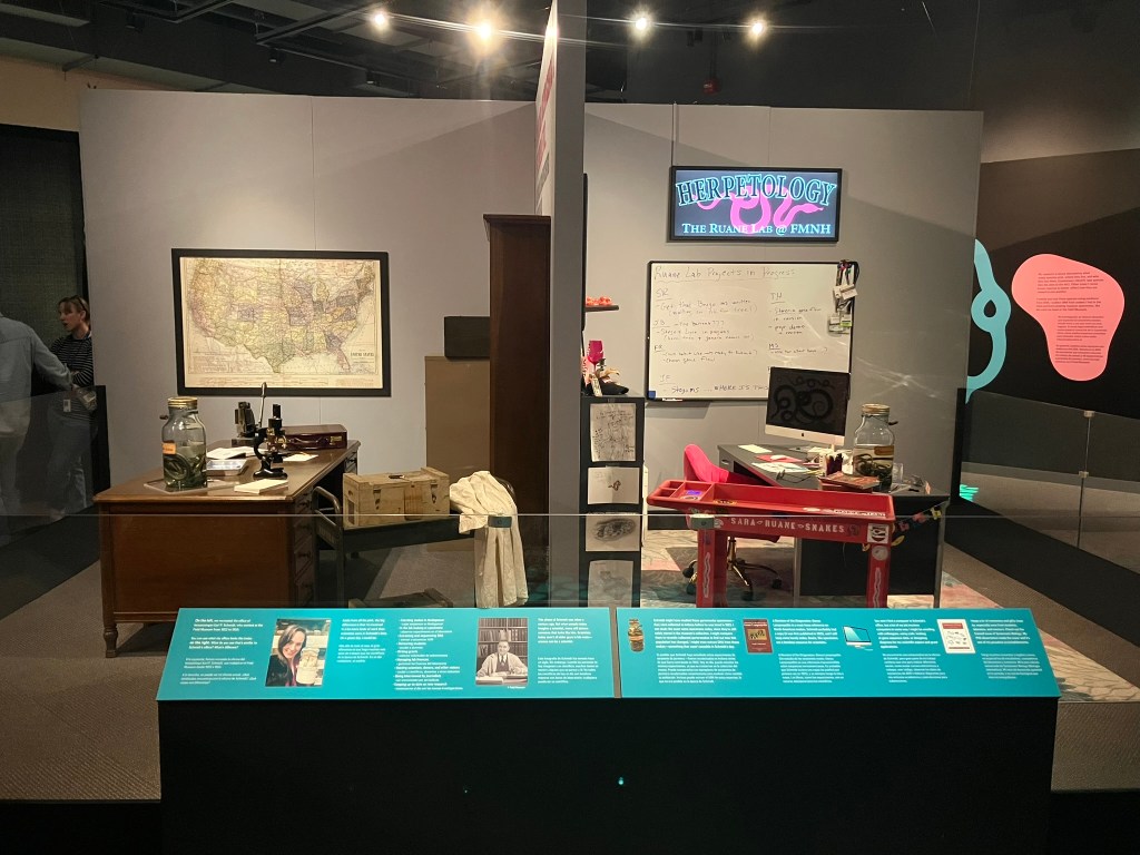 Displays include a recreation of a tabletop “museum” (that Sara made for her family at age six) and the contents of her fieldwork bag (which include everything from a Leatherman multitool to lipgloss). The centerpiece is a pair of office dioramas. One is Sara’s office today, and the other is that of Karl Schmidt, who was the Field Museum herpetology curator a century ago. I think it’s fair to say that we had a blast reconstructing Schmidt’s office, using his original desk and much of his actual book collection. Visitors are encouraged to compare the two spaces: Schmidt’s office is more traditionally professorial, while Ruane’s is full of fun decorations and mementos. But both scientists have the same jar of garter snakes on their desks (museum specimens are an eternal resource), and are referencing the same book (books are also eternal).