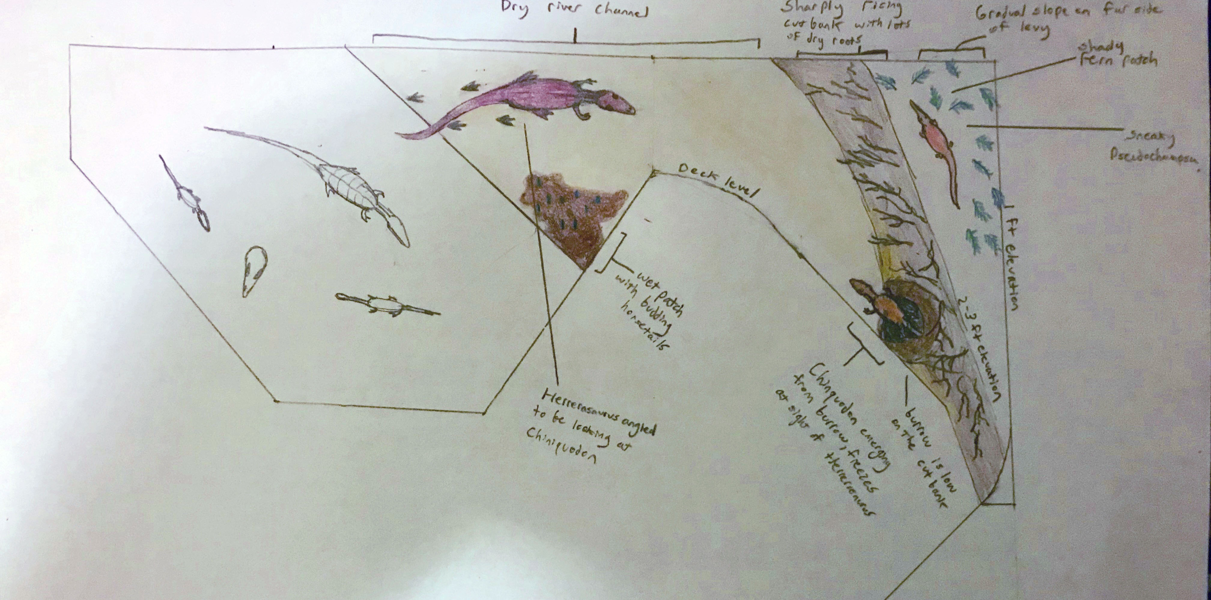 Liam Elward, Janice Lim, Velizar Simeonovski, and Katherine Ulschmid produced the artwork in the Triassic display.
