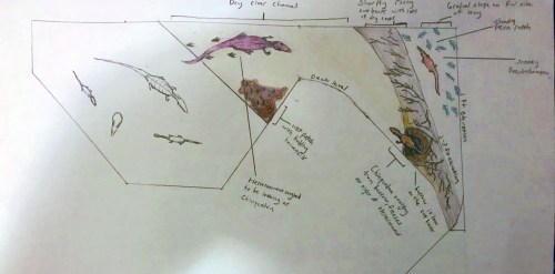 Those familiar with the exhibit will have surely noticed that I have yet to discuss the beautiful 122-foot mural painted by Ely Kish. Running the entire length of the exhibit, this amazing artwork outclasses even the famous “Age of Reptiles” at the Yale Peabody Museum in terms of scale and number of subjects depicted. This monumental accomplishment will be the subject of the next post – stay tuned!