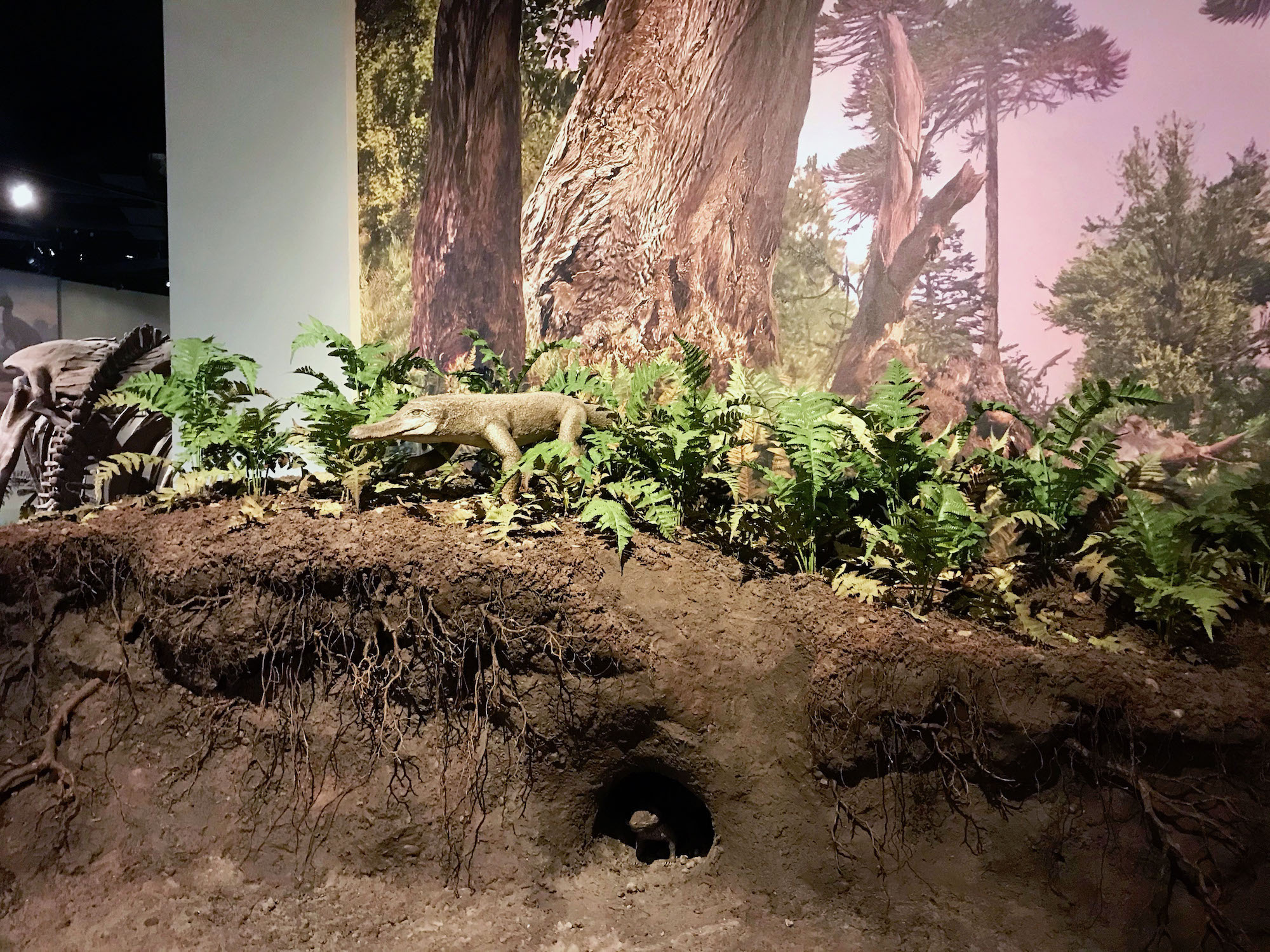 The Chiniquodon burrow is set in the bank of a dry stream bed, part of a larger river system visible in the background mural. Photo by the author.