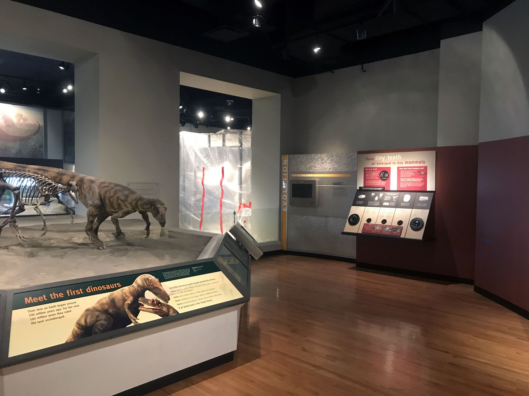 Unfortunately, the 2006 version of the Triassic gallery never had much drawing power—the lure of the larger dinosaurs around the corner was too great. This was a shame, because the Triassic is a really important chapter in the story of life on Earth. Life bounced back after the biggest mass extinction ever, and the new groups that evolved on land would be major players up to the present day. The ancestors of everything from crocodiles and turtles to mammals and dinosaurs can be traced to this time. We thought the origin of mammals was particularly important to emphasize, both because these were our distant ancestors and because the fact that mammals have been around about as long as dinosaurs have isn’t widely known. The gallery already had a small case of Mesozoic mammal teeth, but it was almost completely ignored by visitors. The revamped display needed to put the mammal story front and center.
