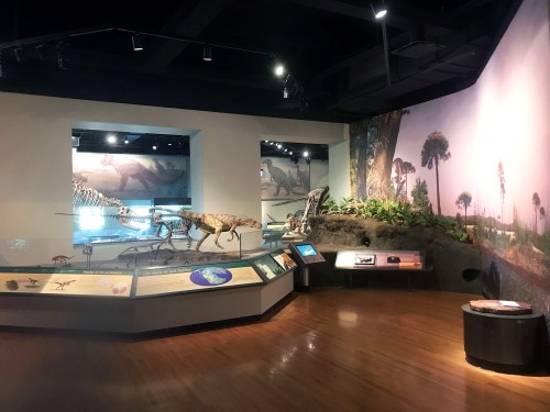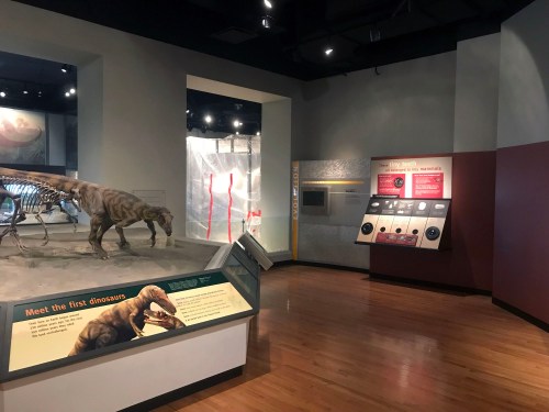 On the left side of the display, the muddy landform gives way to smooth MDF. This is where we complicate the origin of dinosaurs beyond the presentation of Herrerasaurus as an “ur-dinosaur.” Evolution occurs as a continuum and the exact point we define as the start of any particular group is always somewhat arbitrary. This is particularly clear when we look at the first dinosaurs. Dinosaurs belong to a larger group called archosaurs, and they are difficult to distinguish from some of the archosaurs they existed alongside. They looked alike, they ate the same food, and they lived in the same sorts of habitats. Skeletons of Asilisaurus and Parringtonia, a Desmatosuchus skull, and a Teleocrater hindlimb help illustrate Triassic archosaur diversity.