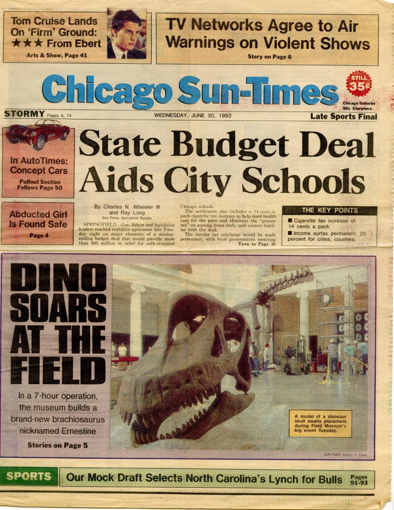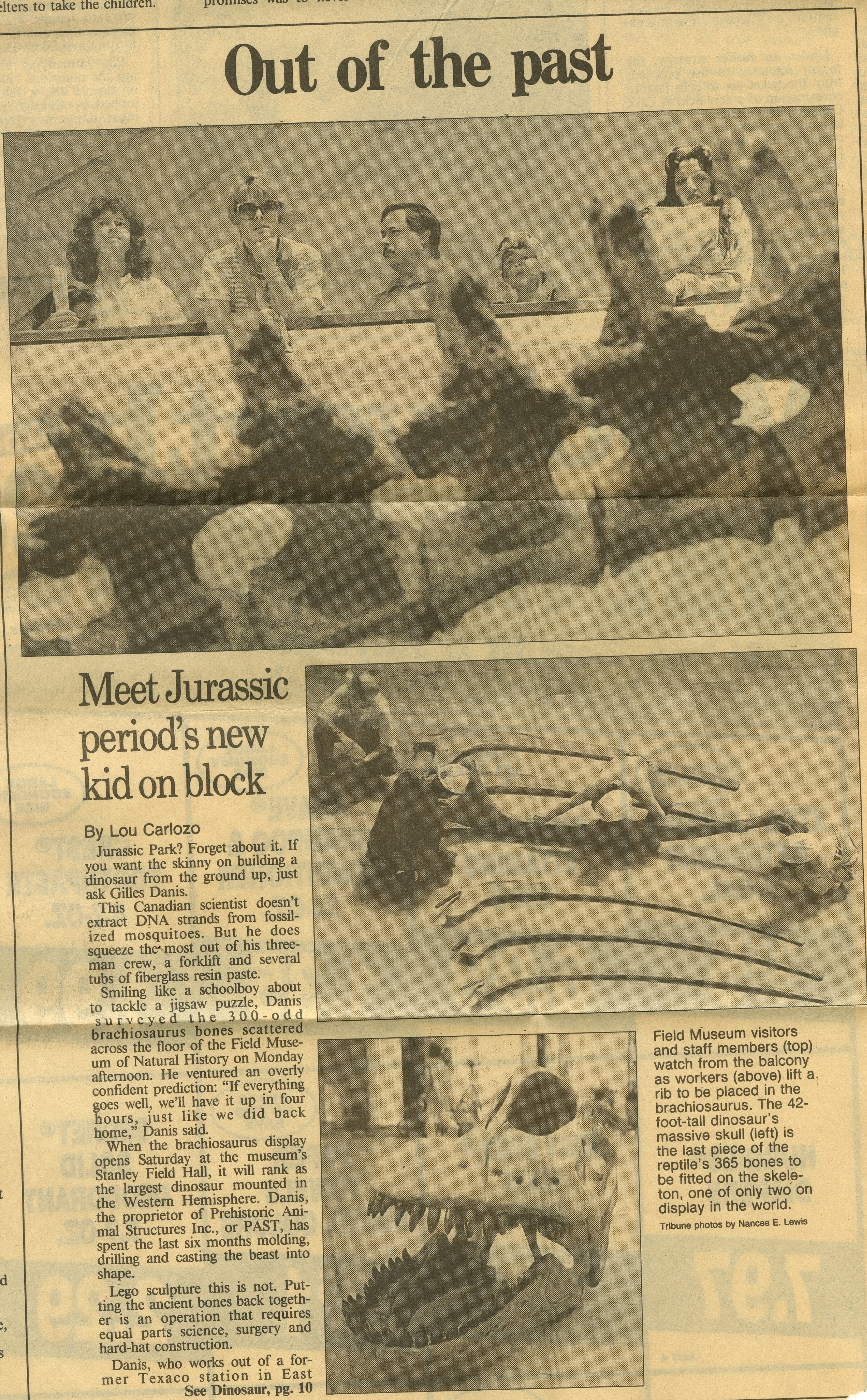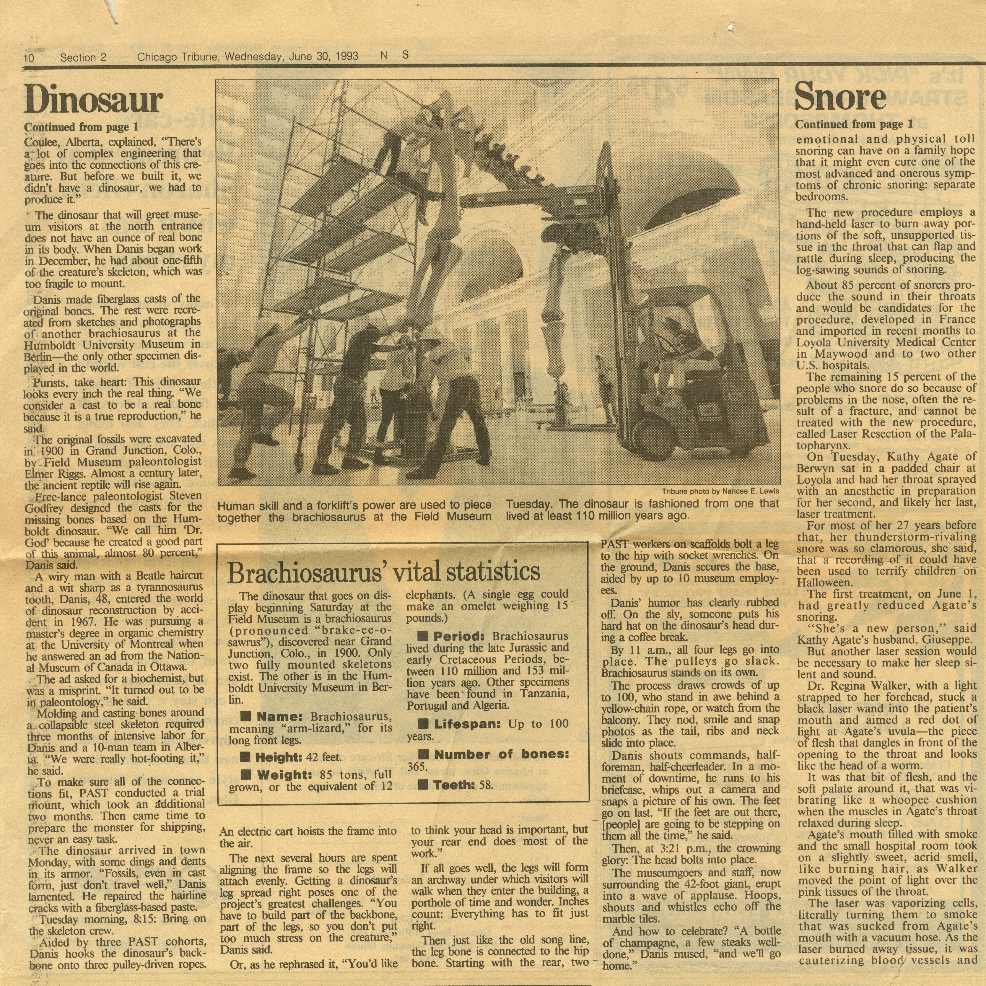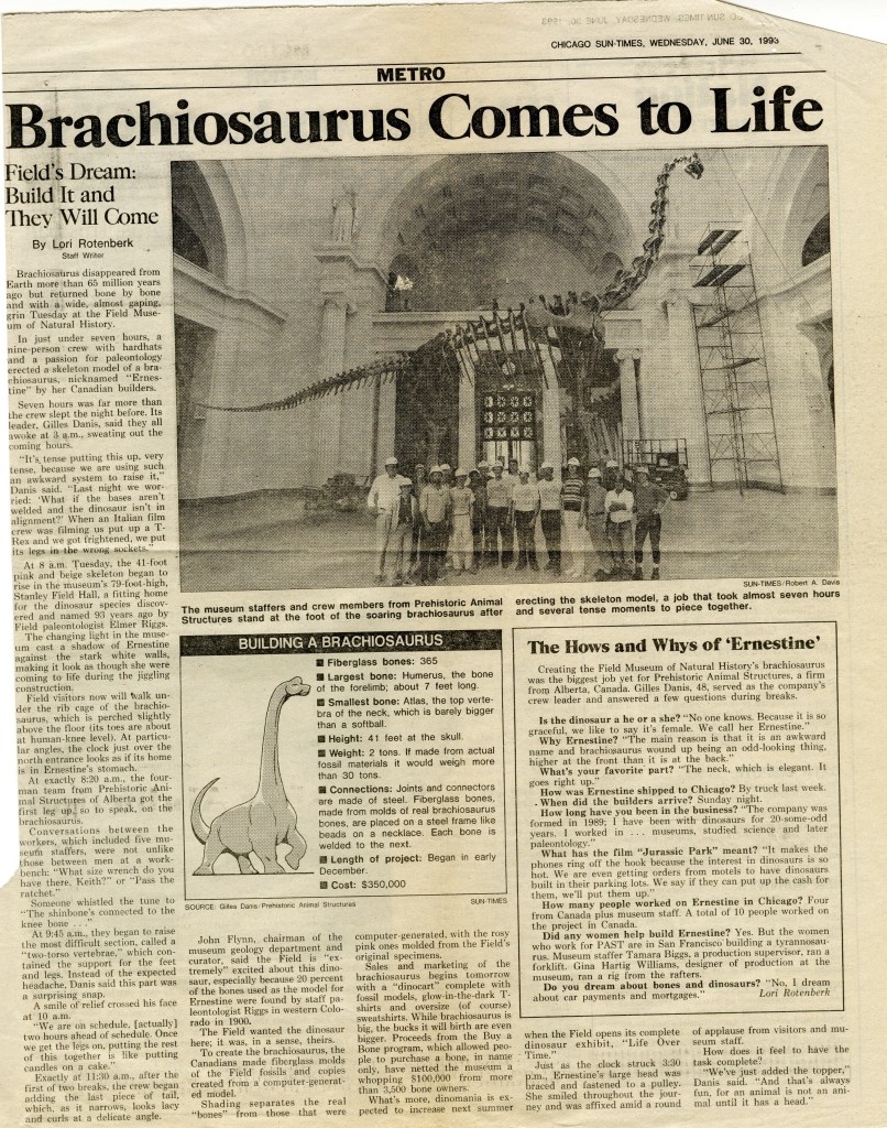 On June 29, 1993 (a Tuesday), Danis, three PAST crew members, and six Field Museum staffers assembled Ernestine in the museum’s central Stanley Field Hall. Reporters from the Chicago Sun-Times and Tribune were present to document the construction (scans of these articles are at the end of this post). Seven hours later, Brachiosaurus was complete, on its feet for the first time in 152 million years. At 41 feet tall, the replica skeleton was tall enough to peer over the second floor mezzanine and into the entrance to Life Over Time.