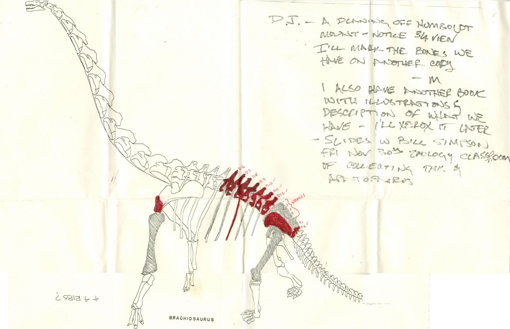 When the Field Museum was exploring the idea to create a complete replica Brachiosaurus, an unknown staffer (“M”) drew up this illustration to show how much would need to be reconstructed. This image is stitched together from multiple scans.