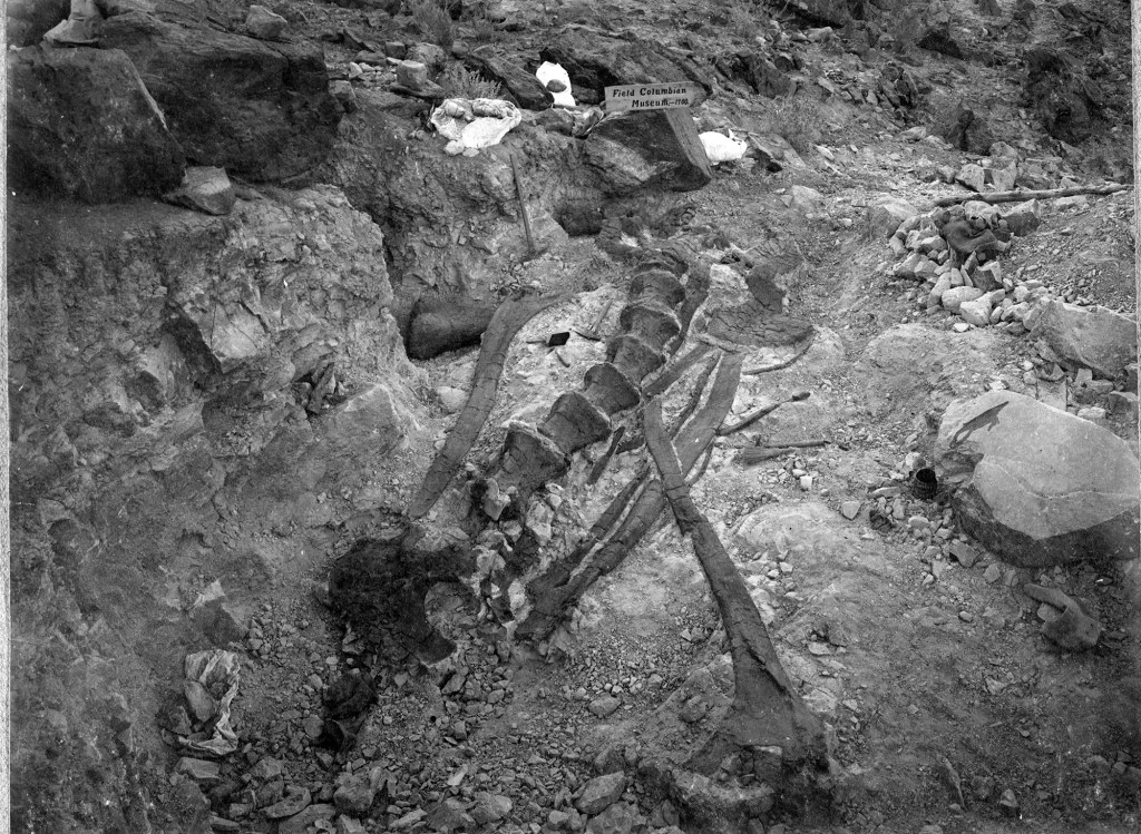 In 1900, Riggs was prospecting near Grand Junction, Colorado with assistant Harold William Menke and camp cook Victor Dames. Their quarry was an exhibit-worthy specimen of Brontosaurus, the largest known dinosaur at that time. On July 4, Menke made a promising find: a giant limb bone that was the right size to be a Brontosaurus femur. The group began excavating and eventually revealed additional limb bones, nine-foot ribs, an articulated series of dorsal vertebrae, the sacrum, and a scattering of other bones. The course-grained, pebbly matrix suggested burial in a fast-moving river, which probably swept away the missing parts. All told, they had about 25% of a skeleton—not enough to mount for display but still worth collecting.