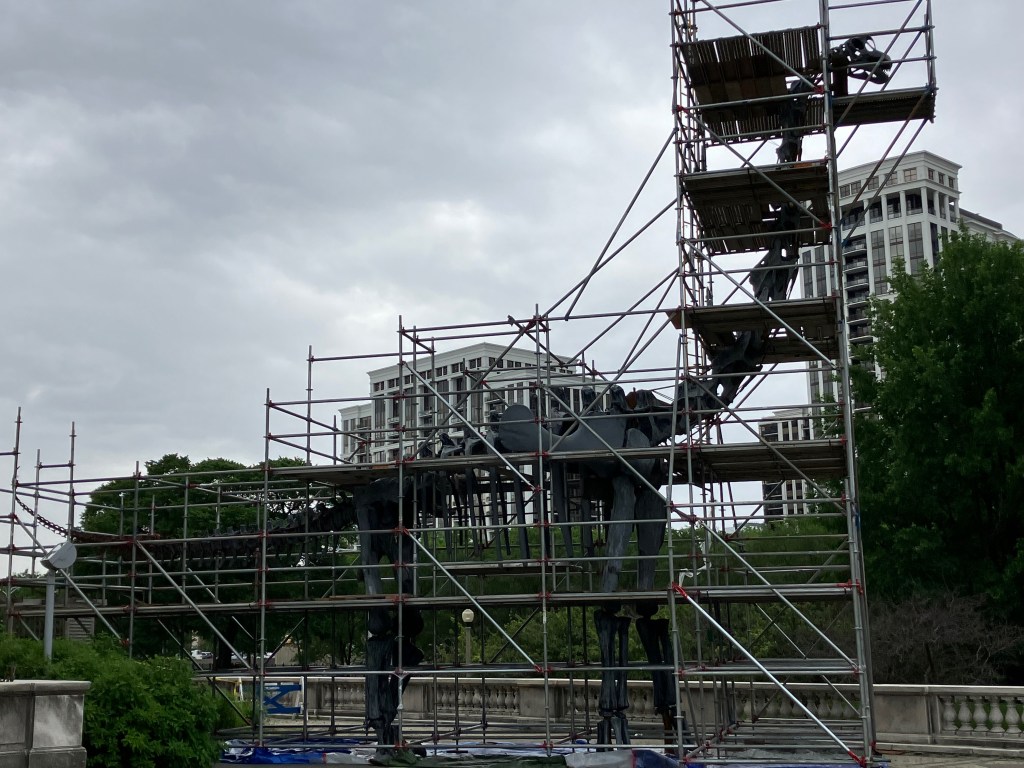 Ernestine’s stint in Stanley Field Hall wound up being short-lived. The Field Museum acquired SUE the Tyrannosaurus in 1997, and the mounted skeleton took the sauropod’s place in May 2000. Ernestine was relocated to O’Hare International Airport, where it remains today. Meanwhile, the museum commissioned a second Brachiosaurus replica to be displayed outdoors. Made from durable, all-weather plastic resin, the outdoor Brachiosaurus stood on the northwest terrace for the next 23 years. Notably, it outlasted SUE’s time in Stanley Field Hall: the Tyrannosaurus was relocated to its own gallery in 2018, and a cast of the Argentinian sauropod Patagotitan now occupies the Field Museum’s central space.