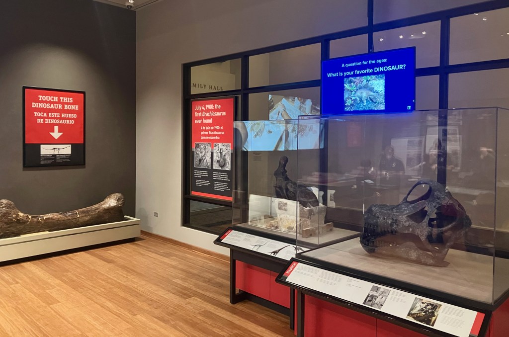 The Brachiosaurus display in the Field Museum’s Science Hub includes parts of the holotype, a replica skull, and more. Photo by the author.
