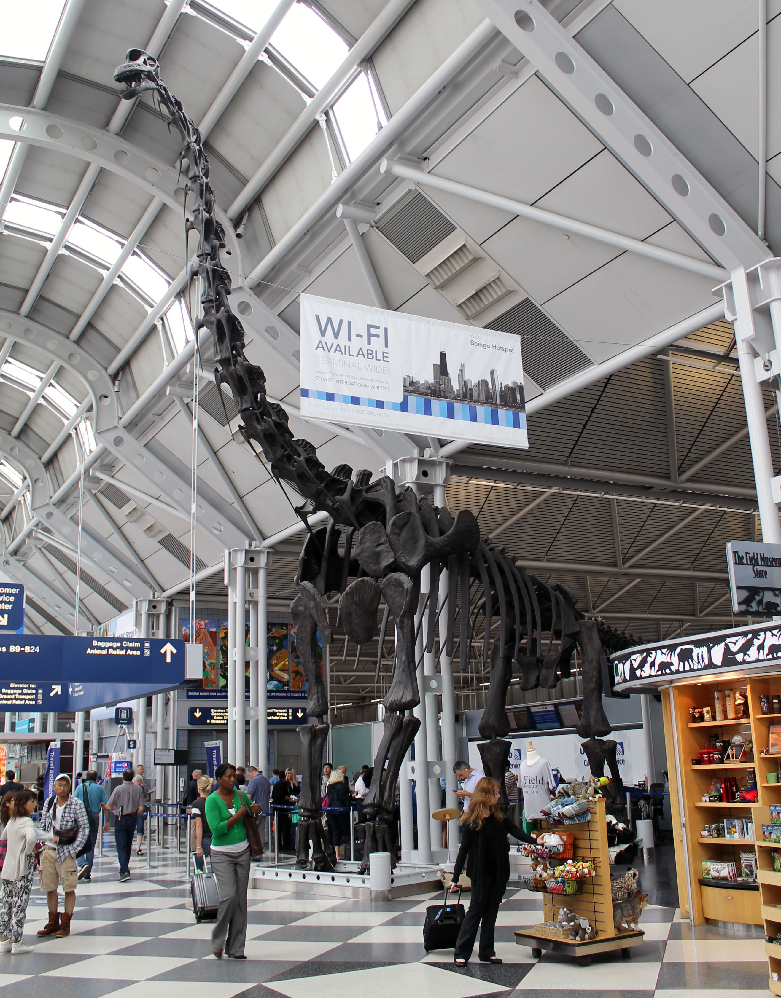 Ernestine the Brachiosaurus has stood in the United terminal at O’Hare since 1999. Photo by the author.