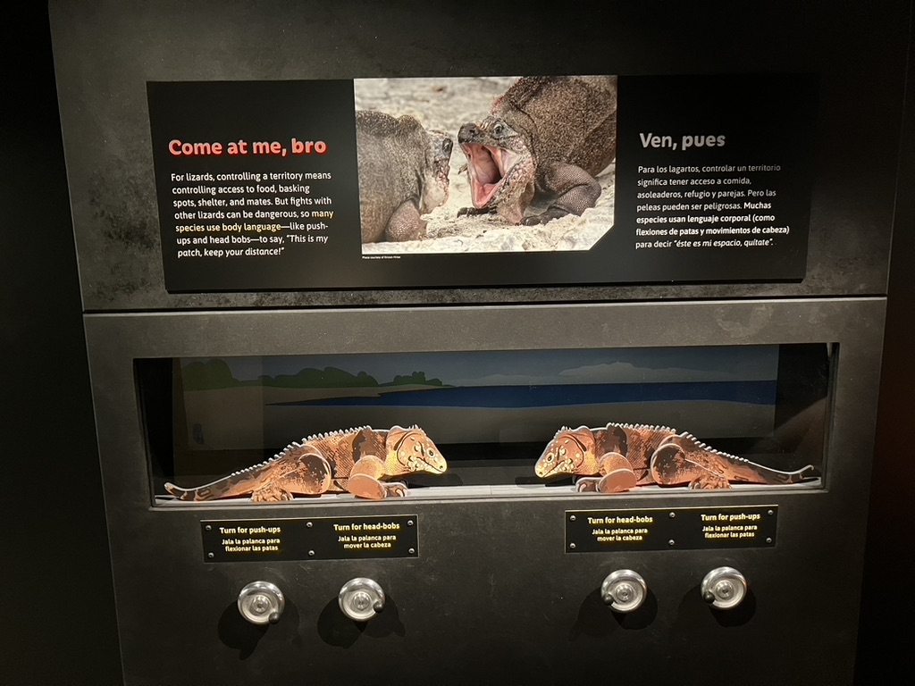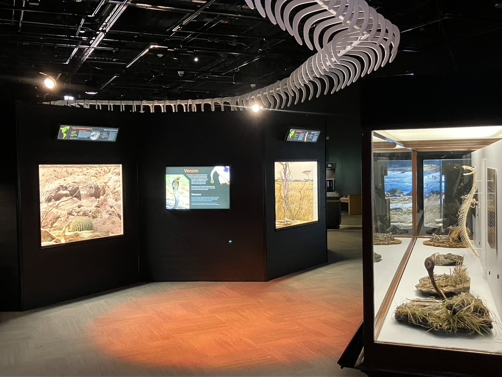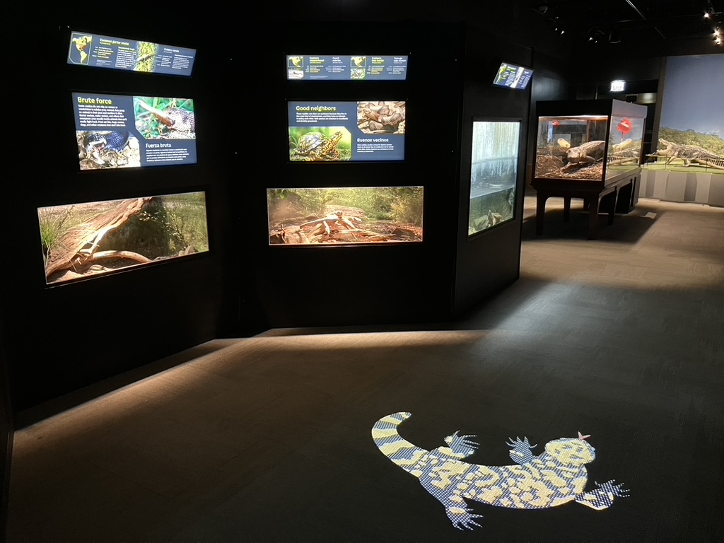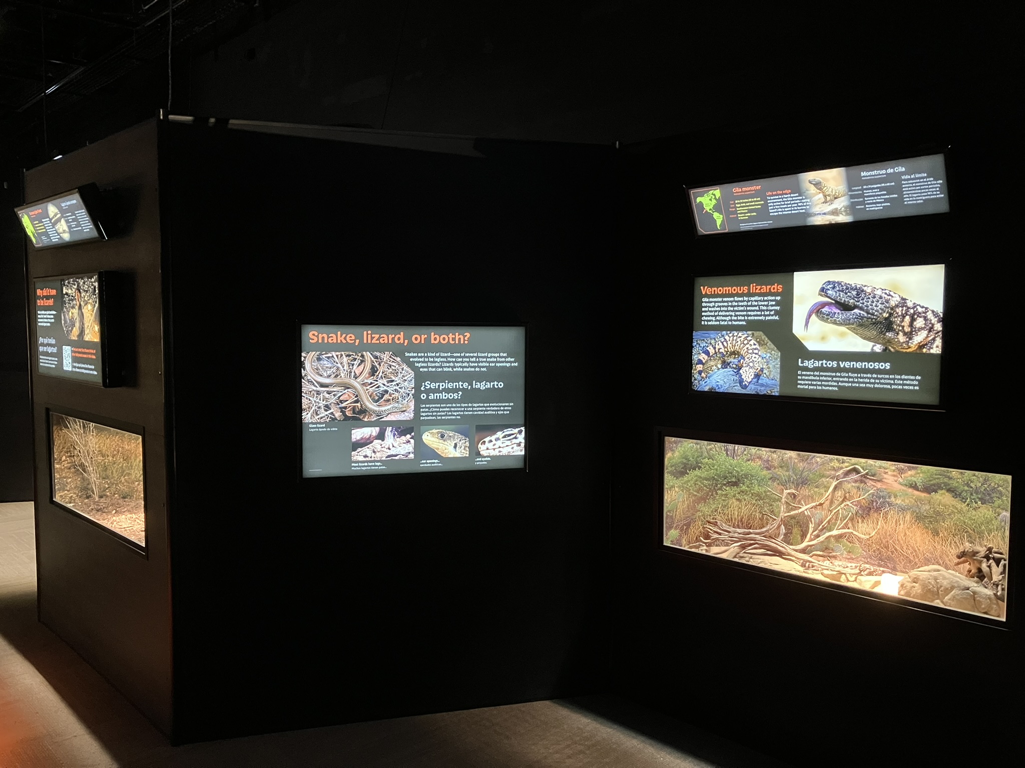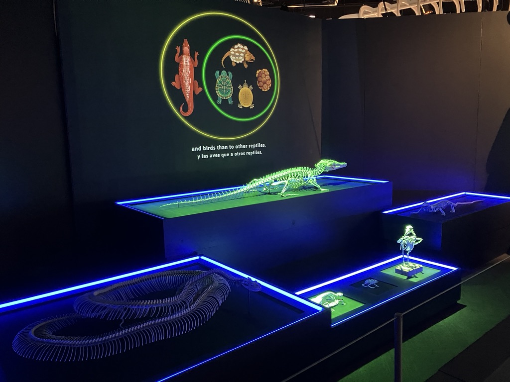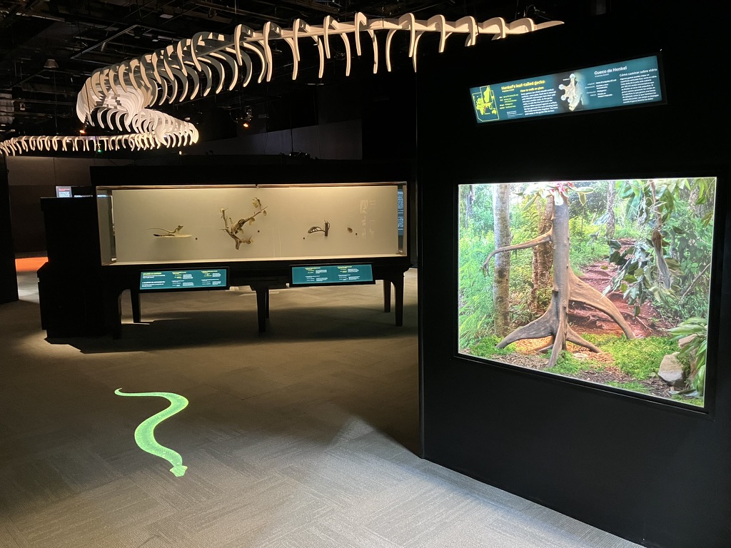 The other benefit of the biome-based organization is that we didn’t have to get bogged down with phylogeny in every label. Reptile classification is full of nested categories and apparent contradictions: for example, a snake is a kind of lizard, but there are are also legless lizards that aren’t snakes. Rather than distracting visitors with constant definitions and explanations, we opted to move the entire classification discussion to a single, prominent “object theater” near the exhibition’s entrance. Spotlights shine on mounted skeletons in different combinations as a narrator walks visitors through the main reptile groups and how to recognize them, while also clarifying that amphibians are not reptiles (but birds are). In under two minutes, visitors gain a shared vocabulary they can use as they explore the rest of the exhibition.