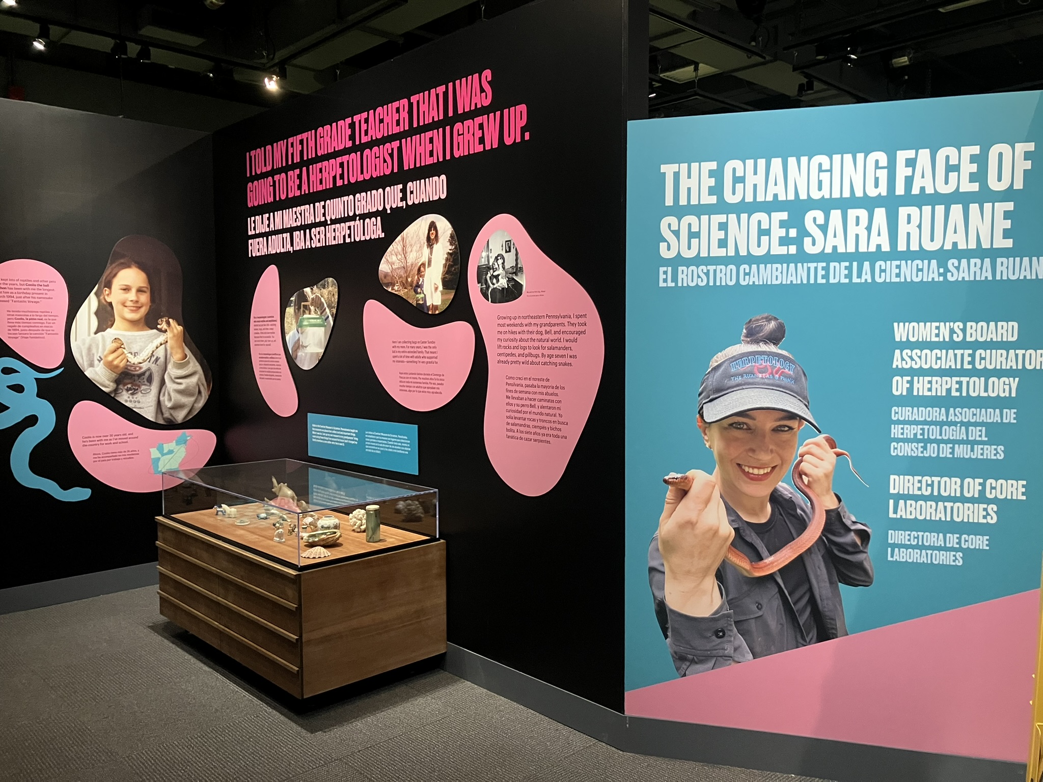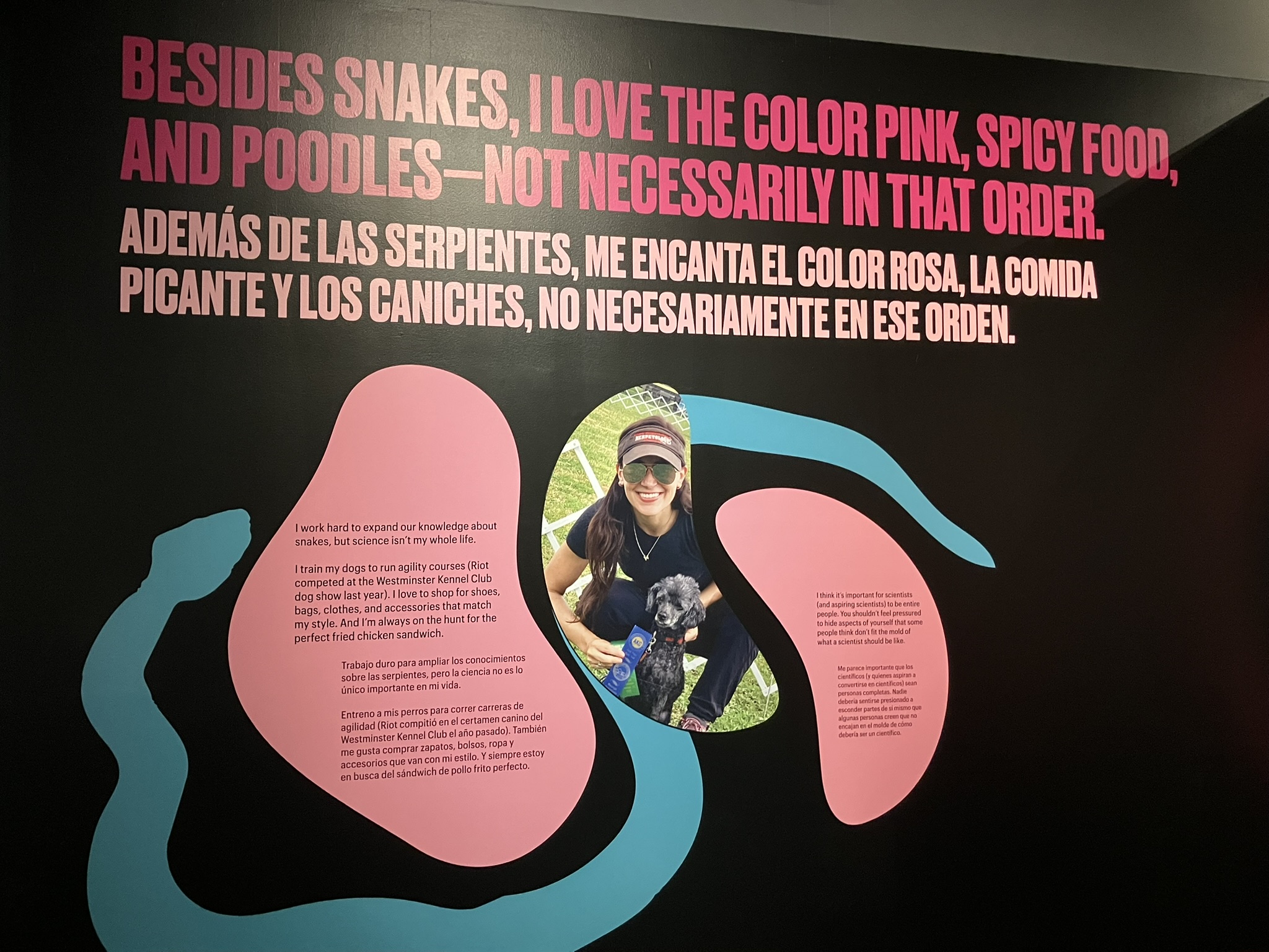 The latest entry in the series features aforementioned herpetology curator Sara Ruane. Sara studies the diversity and evolution of snakes, and has been fascinated by reptiles from a young age. However, Sara also wanted the exhibition to communicate that being a scientist is only part of who she is. Sara loves training her toy poodles, shopping for designer bags, and curating her unique fashion sense—you can be a great scientist while also being a complete person.
