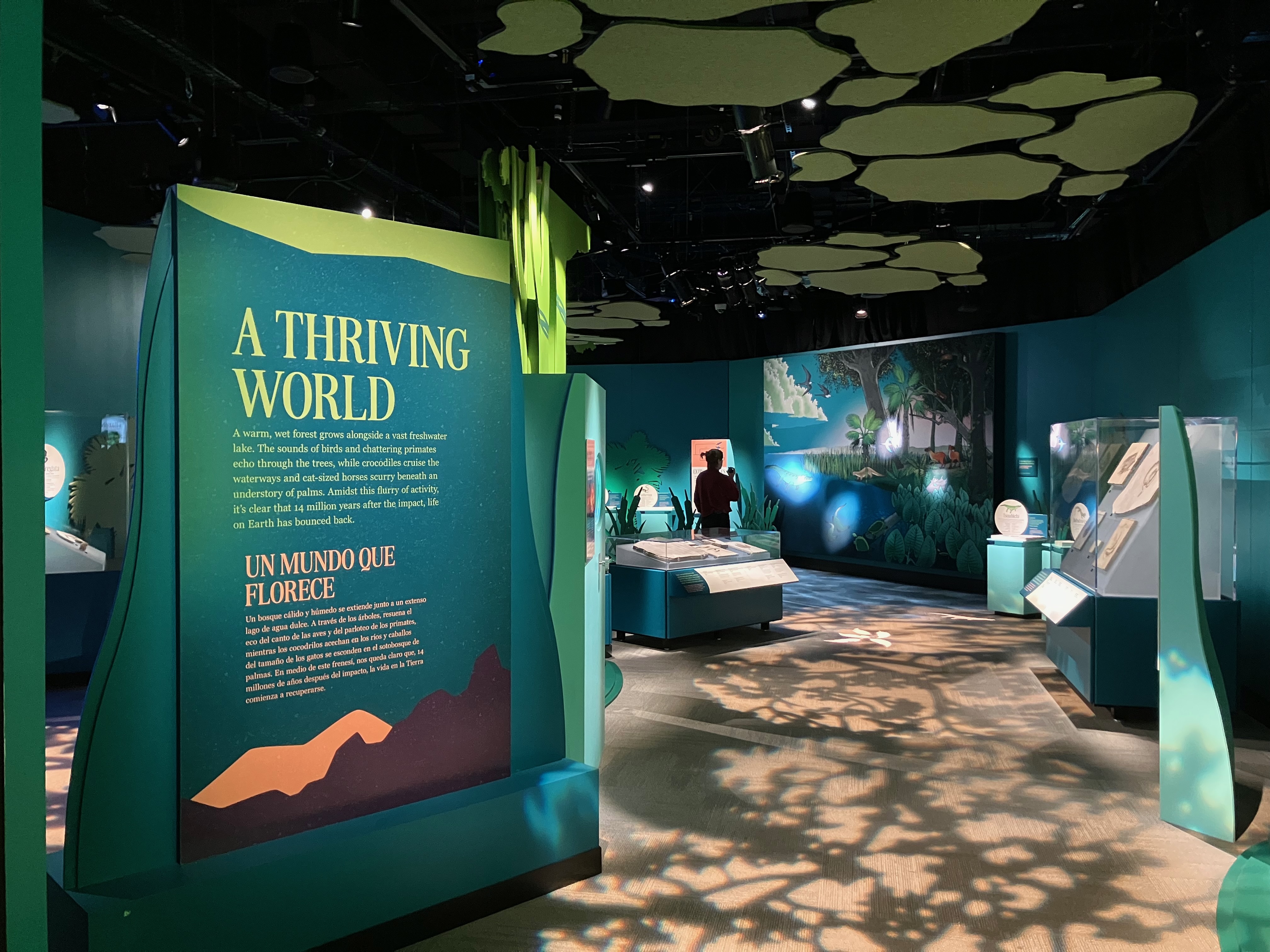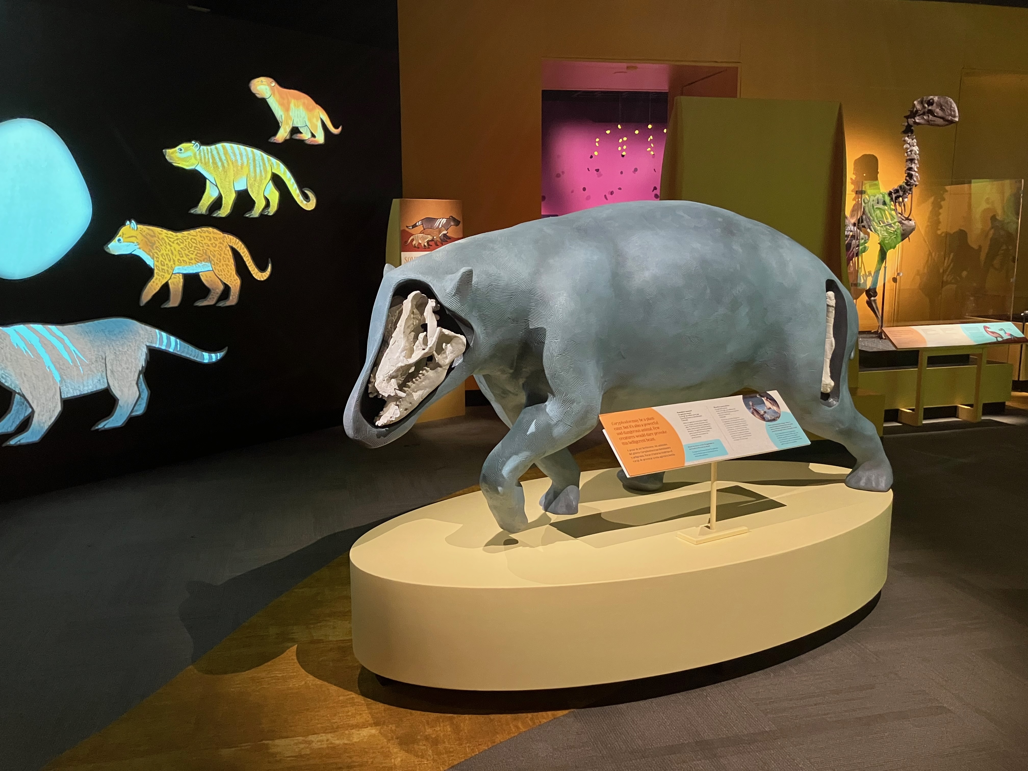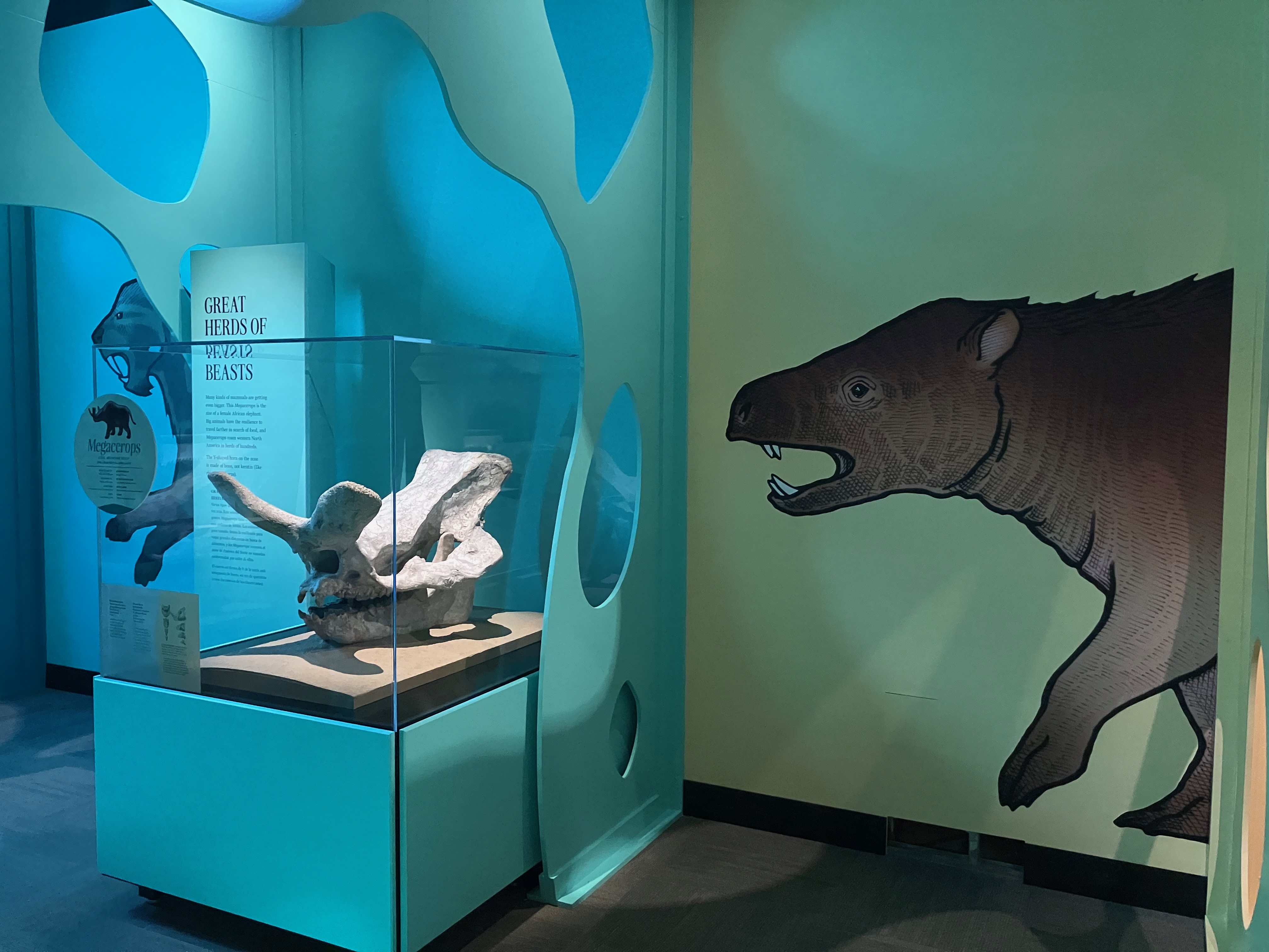 Since so many early Paleogene fossils are on the small side, large media and media-adjacent displays often take center stage. After the Age of Dinosaurs opens with a dramatic presentation of how the asteroid impact devastated global ecosystems, animated in a paper cut-out style by Rachel Oftedahl. A projection of ash billowing through a burnt-out forest adds a somber mood to the next gallery. Look closely at the life-sized projections of pantodonts later in the exhibition and you’ll see their eyes periodically blink. And in the Green River section, visitors can add to the ubiquitous forest soundtrack by standing in spotlights shaped like different animals—these trigger unique sounds that add to the gallery-wide chorus. I’m excited to see how visitors respond to these semi-hidden, playful elements within the exhibition, and how they contribute to the experience overall.