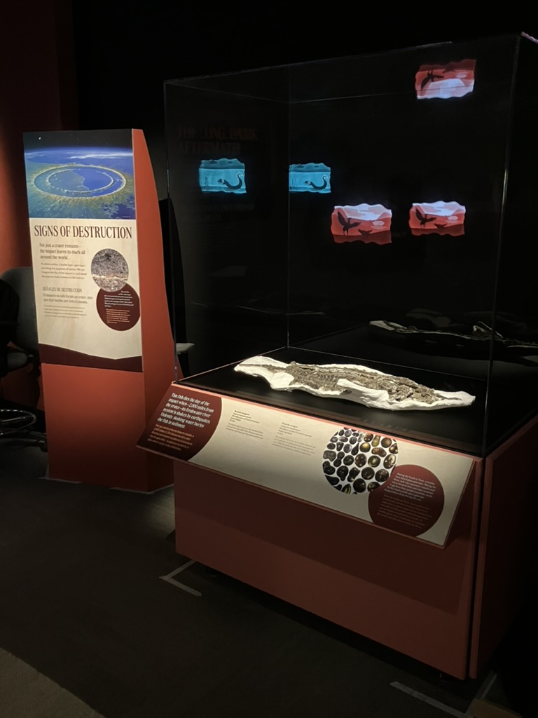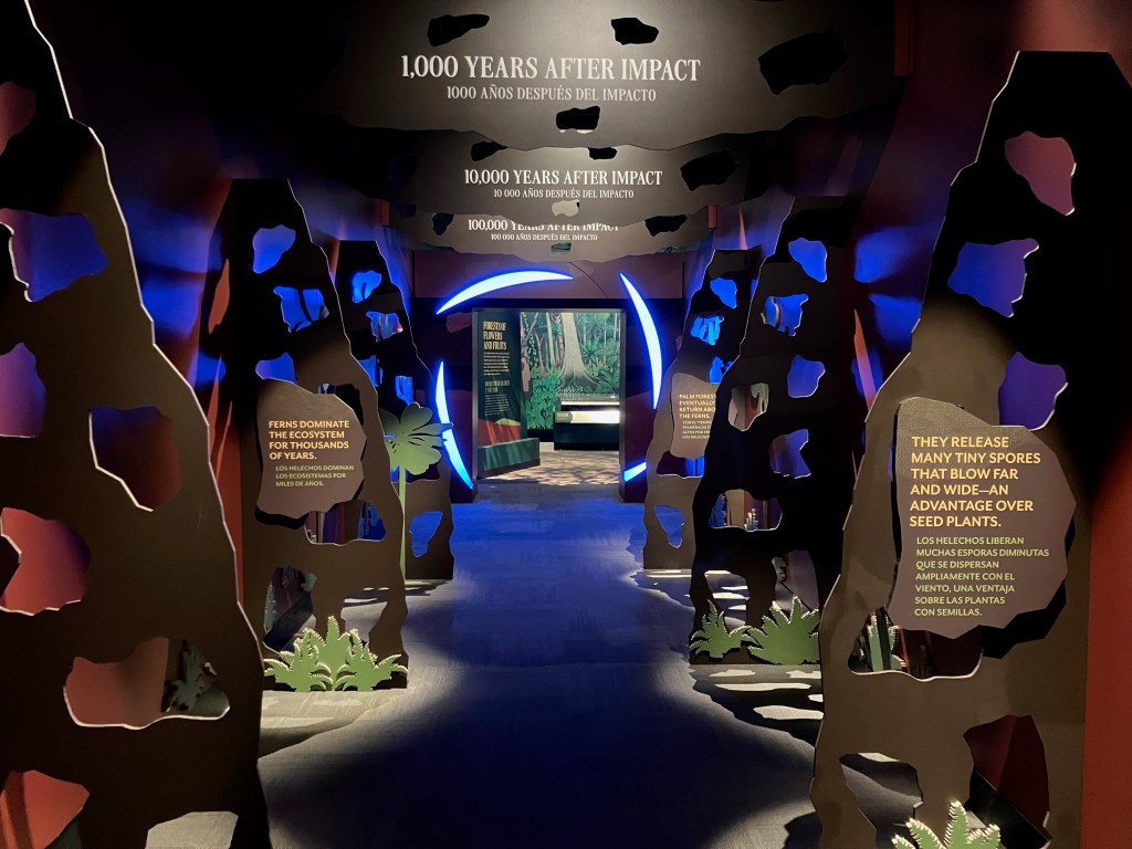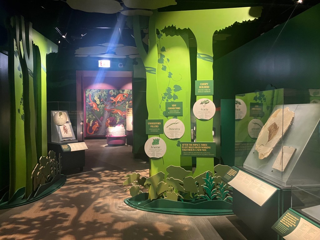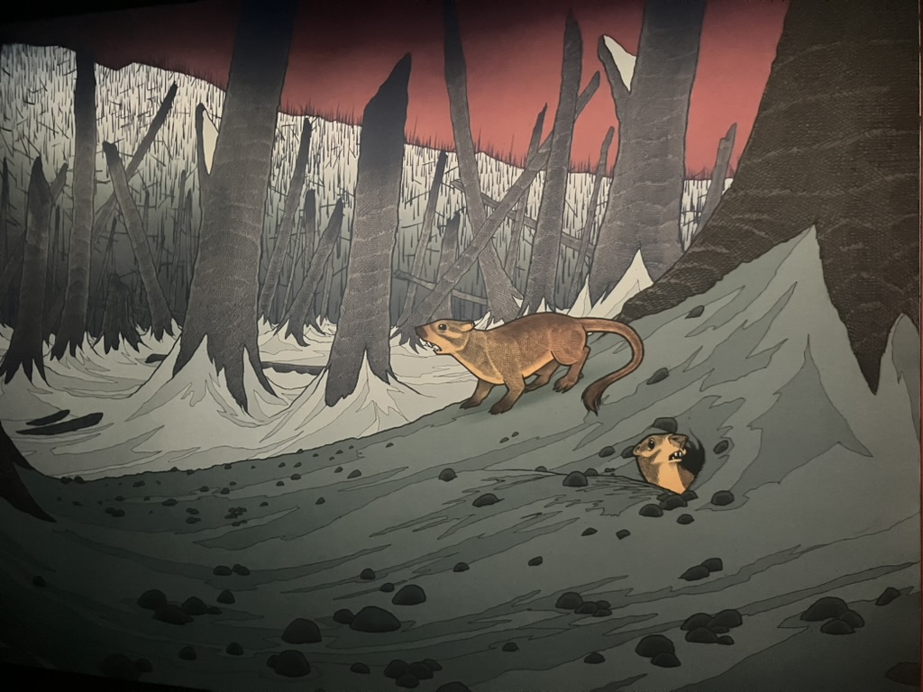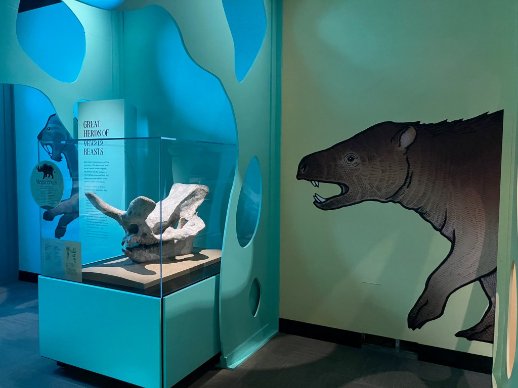 Since so many early Paleogene fossils are on the small side, large media and media-adjacent displays often take center stage. After the Age of Dinosaurs opens with a dramatic presentation of how the asteroid impact devastated global ecosystems, animated in a paper cut-out style by Rachel Oftedahl. A projection of ash billowing through a burnt-out forest adds a somber mood to the next gallery. Look closely at the life-sized projections of pantodonts later in the exhibition and you’ll see their eyes periodically blink. And in the Green River section, visitors can add to the ubiquitous forest soundtrack by standing in spotlights shaped like different animals—these trigger unique sounds that add to the gallery-wide chorus. I’m excited to see how visitors respond to these semi-hidden, playful elements within the exhibition, and how they contribute to the experience overall.