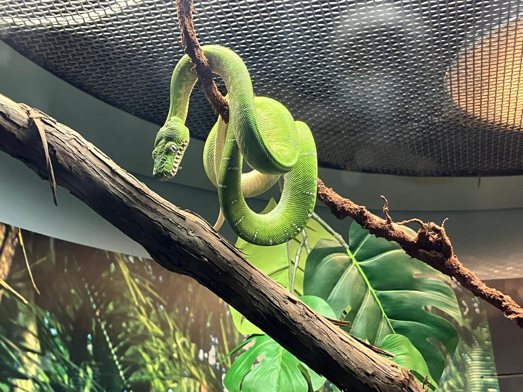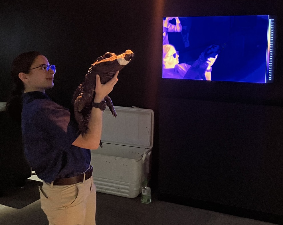 There are no touchscreens in Reptiles Alive. Instead, we went all-in on simple, tactile interactives. Whether you’re puppeteering a pair of iguanas to demonstrate lizard body language or testing your puny human strength against the bite force of a Nile crocodile, the action being performed always directly illustrates the concept under discussion. The fanciest piece of hardware in the exhibition is a thermal camera. It’s one thing to tell visitors that reptiles are cold-blooded, but it’s quite another to see the zookeeper hold a room-temperature snake up to the camera. The human glows orange while the snake matches the blues and purples of the space around it.
