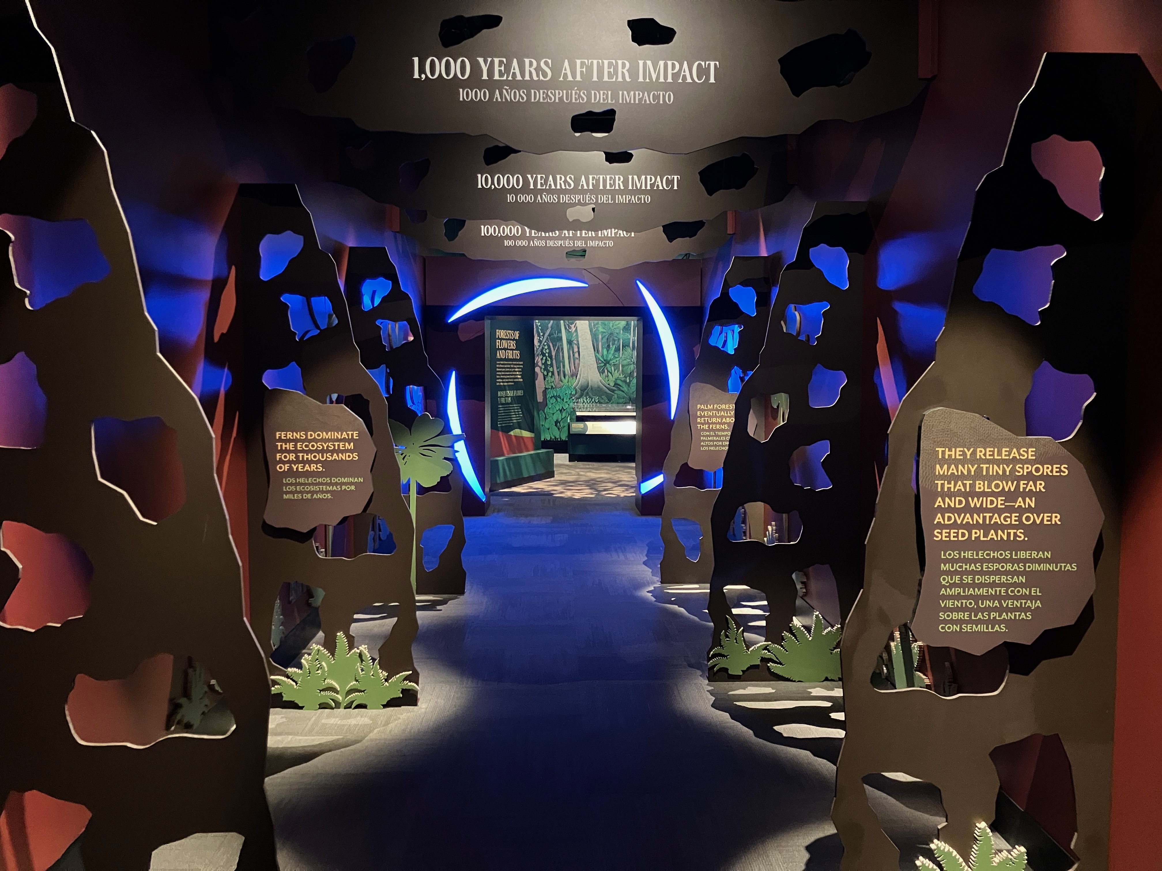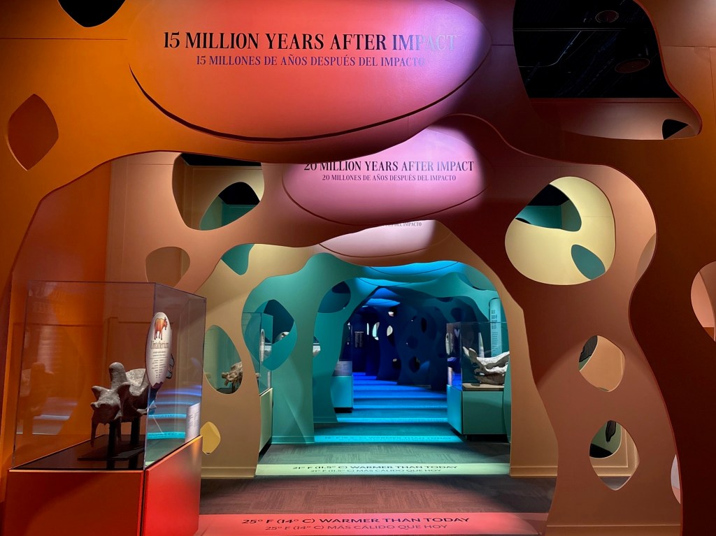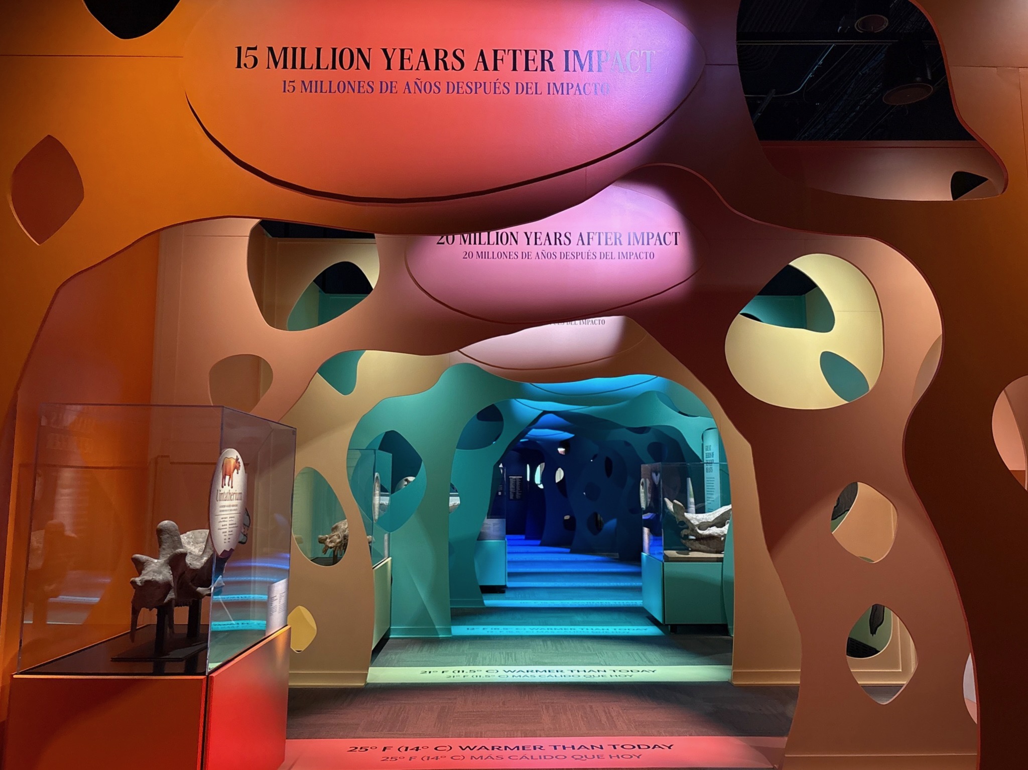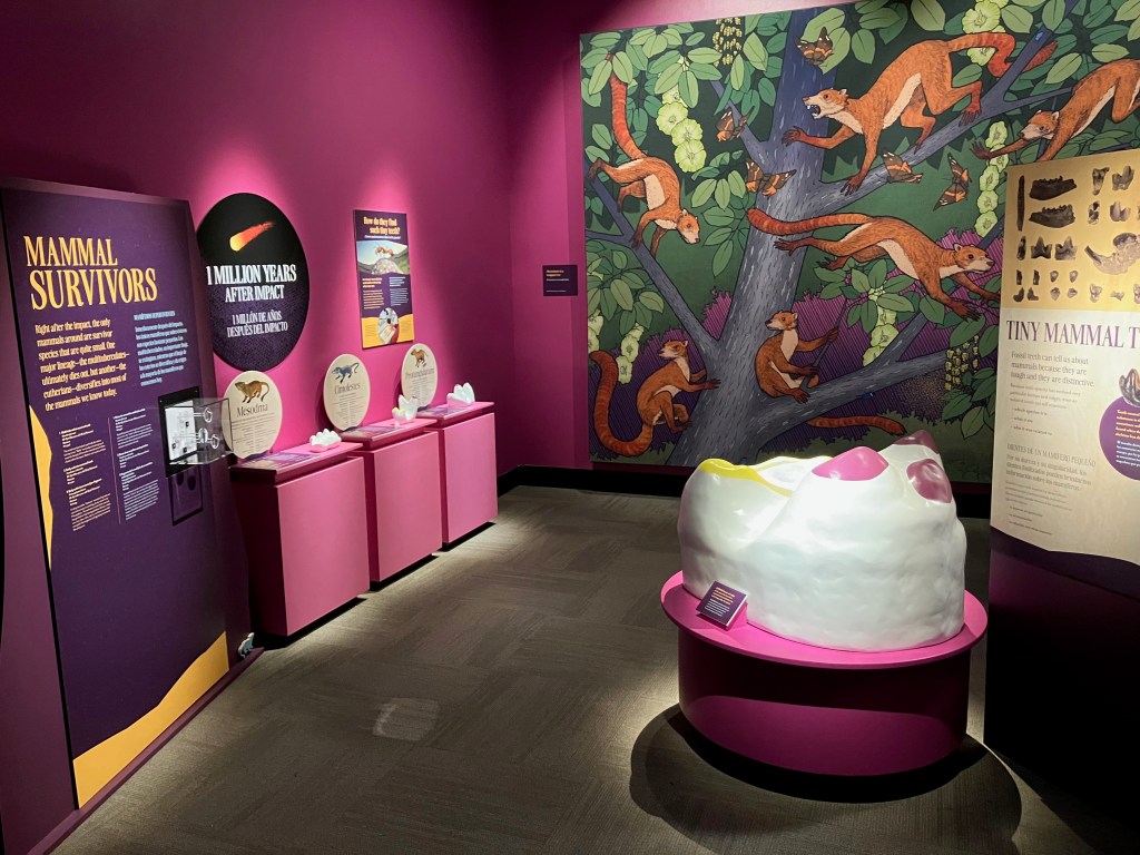 My colleague Marie Georg led the development of this exhibition—I joined a little later on to flesh out and write the second half. Curators Ken Angielczyk and Fabiany Herrera advised on the science, along with nearly a dozen other specialists. Meanwhile, the team worked with Chicago poster artist Jay Ryan to create the look of the show. Jay’s style is bright and bold, with a bit of a pop art feel. He brought those signature qualities to the six murals and nearly sixty standalone illustrations he created for After the Age of Dinosaurs, and the rest of the exhibition’s design follows suit. The result is a paleontology exhibit that looks nothing like the Field Museum’s permanent Evolving Planet, or really any other major fossil exhibit that I’m aware of.