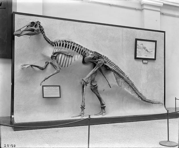 This relief-mounted Edmontosaurus was the first complete Mesozoic dinosaur displayed at USNM. Photo courtesy of the Smithsonian Institution Archives.