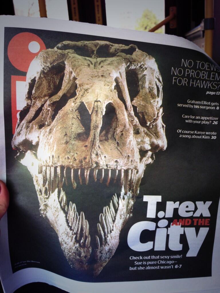 After a private event not unlike the one held by Osborn in 1915, Sue was revealed to the public on May 17, 2000 with the literal raising of a curtain. A week-long series of celebrations and press junkets introduced Sue to Chicago, and she has been one of the city’s biggest attractions every since. All the publicity paid off, at least in the short term: FMNH attendance soared that year from 1.6 million to 2.4 million. 14 years later, Sue the Tyrannosaurus is still known by name, and is even used as the voice of FMNH on twitter. Interestingly, Sue’s new identity as a Chicago landmark seems to have all but eclipsed the legal dispute that was her original source of fame. A recent RedEye cover story goes so far as to proclaim this South Dakotan skeleton as “pure Chicago.”