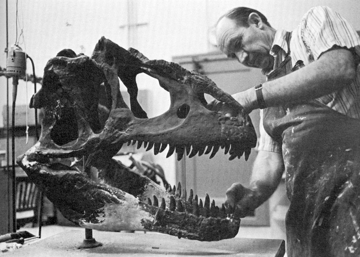 When the NMNH fossil halls were renovated in 1981, the designers noticed that the exhibit badly needed a large theropod mount. Arnold Lewis was tapped to design and construct a complete mounted version of USNM 4734, with some assistance from Ken Carpenter. The tail was cast from a Brigham Young University specimen, but Lewis sculpted the belly ribs and sternum using an alligator skeleton as reference. The completed Allosaurus measured 17 feet from its grinning jaws to the tip of its tail, and a form-hugging armature made it look particularly dynamic.