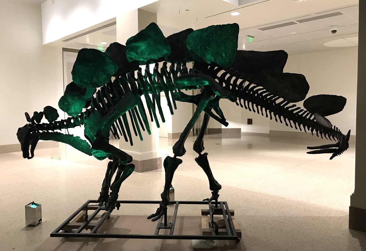 After the halls closed for renovation in 2014, NMNH donated the 2004 Stegosaurus cast to the Virginia Museum of Natural History, a Smithsonian affiliate. The World’s Fair model, meanwhile, now resides at the Museum of the Earth in Ithaca, New York. The roadkill Stegosaurus features prominently in the new National Fossil Hall, mounted upright on the wall by the exhibit’s secondary entrance. A new standing Stegosaurus cast is poised triumphantly over the aforementioned Ceratosaurus. The new cast also corrects problems with how the shoulder girdle was mounted on the previous version.