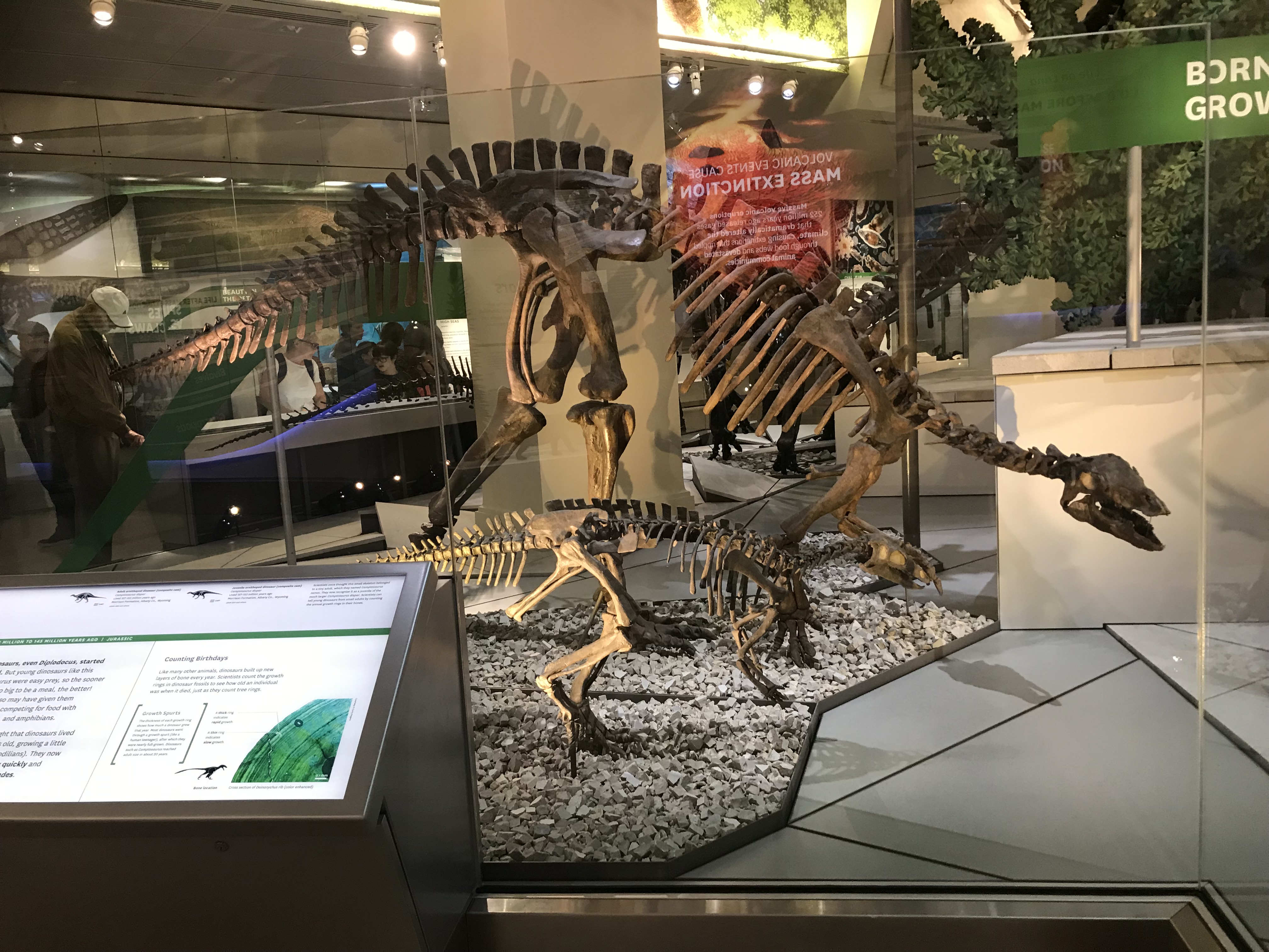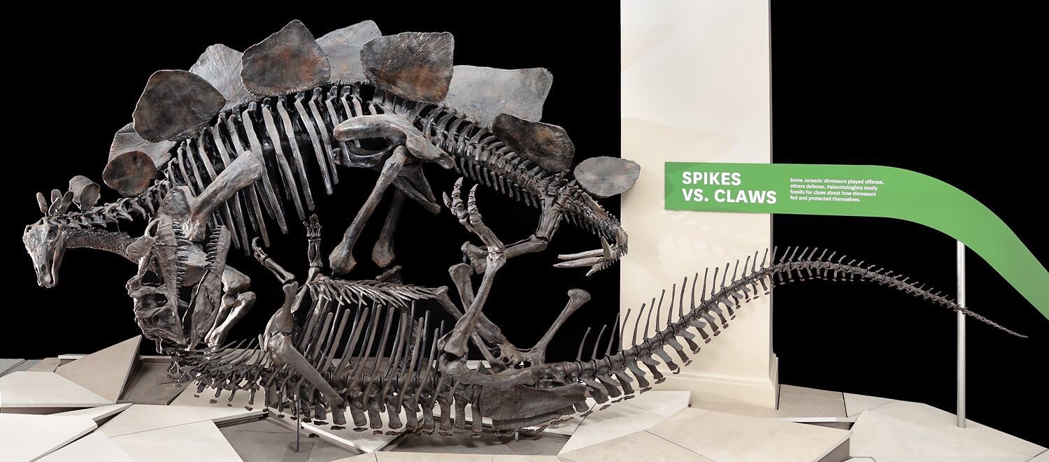 In one of the more dramatic scenes in the Deep Time hall, Ceratosaurus is on the losing end of a fight with Stegosaurus. .